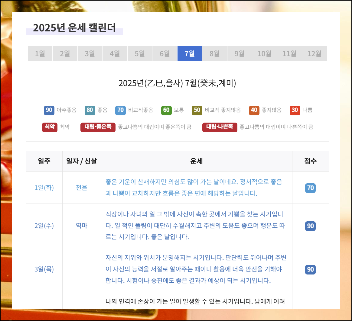 캘린더 서비스는 정말 독특하고 유용한 기능이에요. 매일매일 오늘의 운세를 확인할 수 있어서 하루를 시작하는 마음가짐을 다잡을 수 있습니다. 날짜별로 점수도 알려주니까 한눈에 좋은 날과 조심해야 할 날을 구분할 수 있어요.