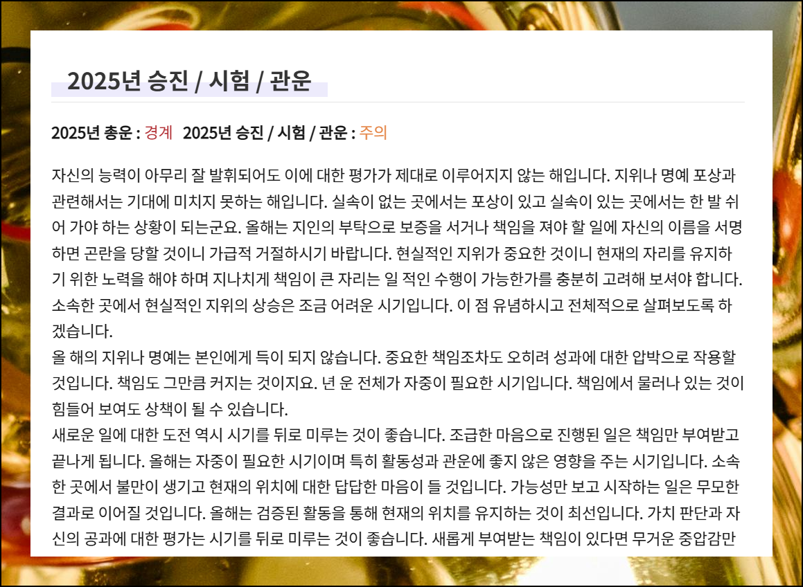 여기서 제공하는 풀이는 정말 깊이가 있어요. 긴 문장으로 구성된 상세한 해석을 통해 풍부한 정보를 얻을 수 있습니다. 동시에 운세 키워드도 함께 제공하고 있어서 시간이 부족한 분들은 핵심만 빠르게 파악할 수 있어요. 부모님의 건강 상태에 대한 조언도 포함되어 있고, 본인에게 다가올 변화도 미리 알 수 있어요.