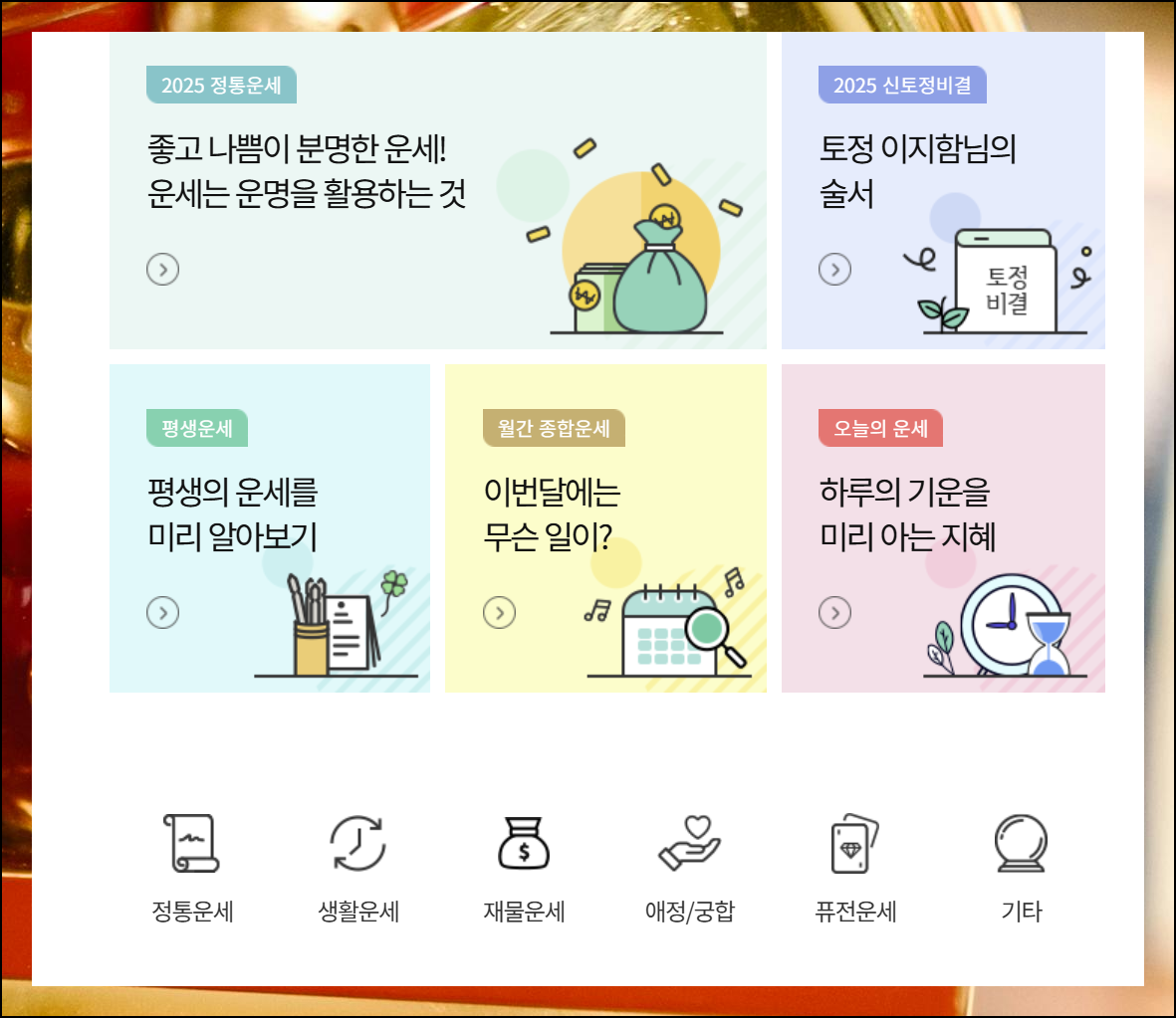 해당 사이트에서는 다양한 운세 프로그램을 통해 나의 운명을 다양한 각도에서 살펴볼 수 있게 도와줘요. 여러 개의 카테고리로 구성되어 있습니다. 정통운세 메뉴에서는 평생에 걸친 운세를 확인할 수 있어요. 10년 단위로 나뉜 대운도 볼 수 있고, 전통적인 토정비결까지 제공하고 있어요.