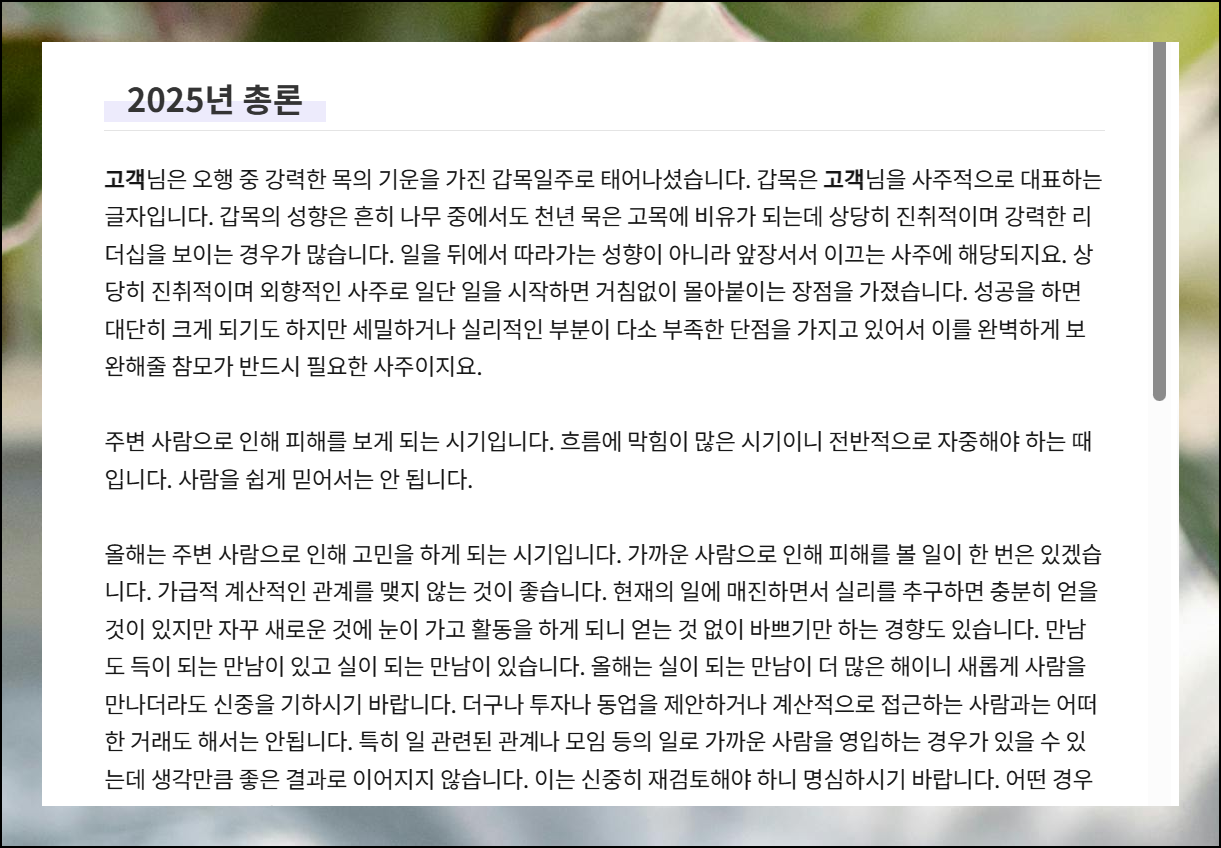 총론 섹션에서는 전체적인 사주팔자를 종합적으로 살펴볼 수 있어요. 내 인생의 큰 틀을 그려볼 수 있는 귀중한 정보들이 담겨 있습니다. 주의해야 할 부분이 있으면 미리 경고해주고, 좋은 조언이 있으면 적극적으로 활용할 수 있도록 안내해줘요.