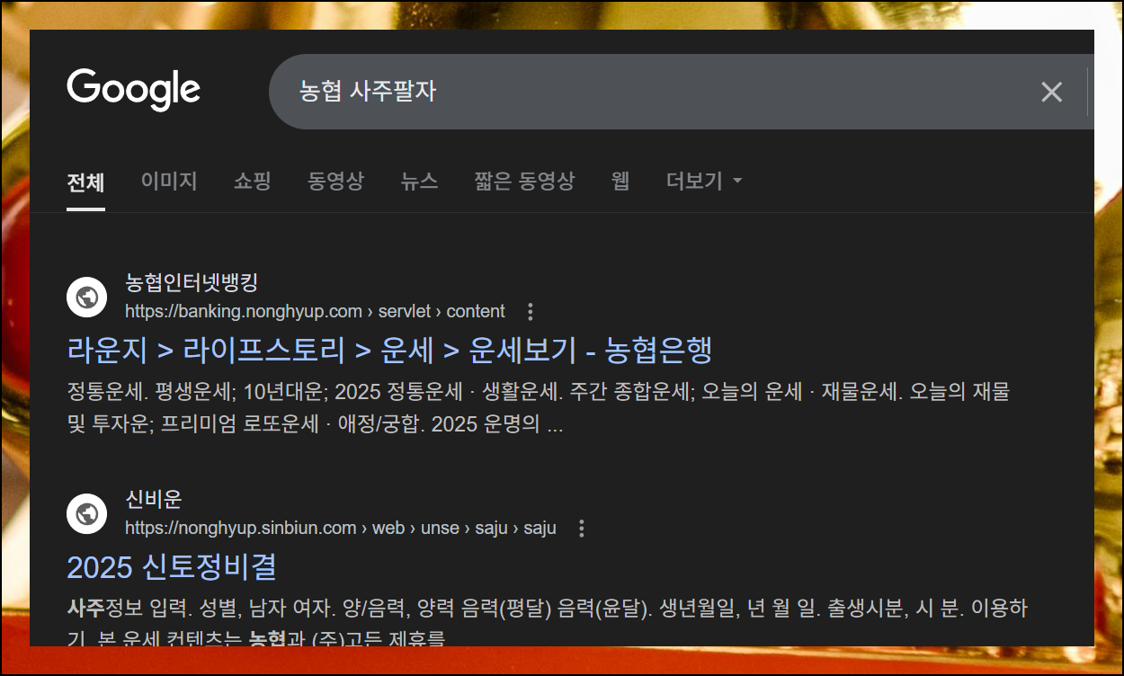 사주팔자를 무료로 확인할 수 있는 특별한 장소가 있어요. 농협 인터넷 뱅킹 사용자들만 알 수 있는 숨겨진 서비스입니다. 검색창에 "농협 사주팔자"만 입력하면 바로 찾을 수 있습니다. 온라인 운세를 찾는 분들 사이에서 조용히 입소문이 나고 있는 곳이에요. 유료 사이트 못지않은 높은 품질을 자랑하는 서비스라서 한번 써보면 계속 찾게 돼요.
