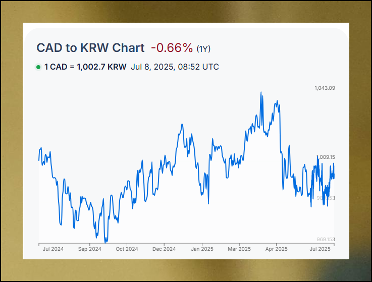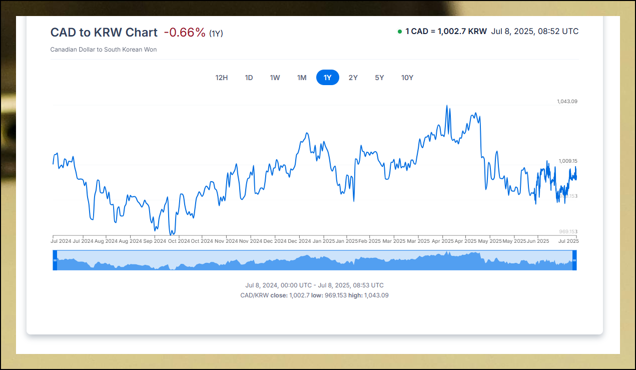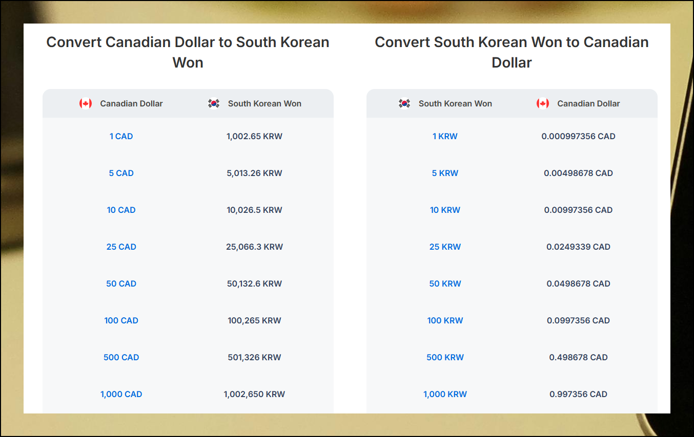 역방향으로도 환율조회가 가능해요. From에 KRW를 넣고 To에는 CAD를 입력하면 됩니다. Amount 칸에는 실제로 환전하고 싶은 금액을 넣어주세요. 예를 들어 100만원을 캐나다 달러로 바꾸면 997.35589CAD가 나온다고 하네요. 다만 실제 환전소에서는 수수료가 포함되기 때문에 조금 더 적은 금액을 받게 될 거예요.