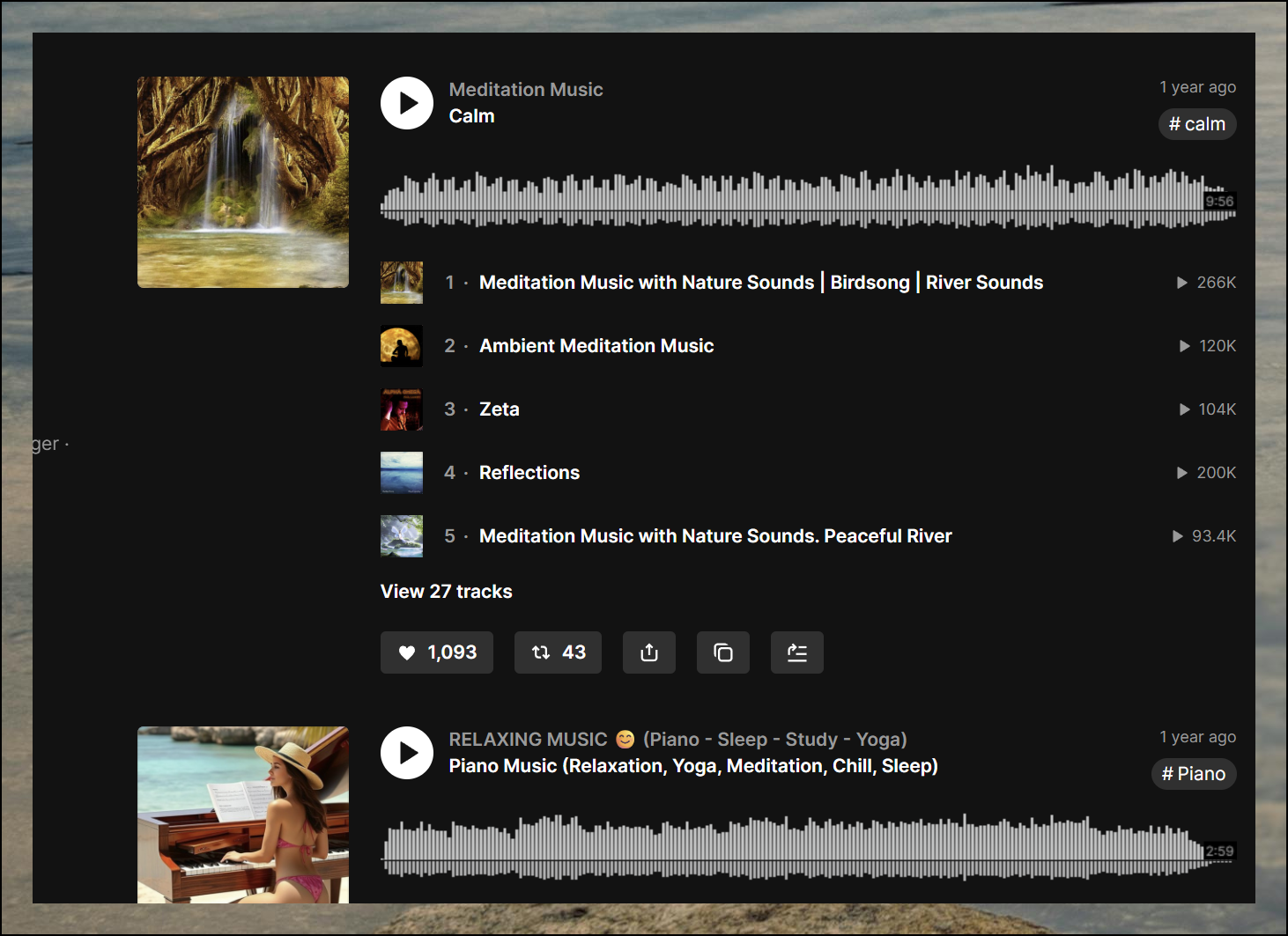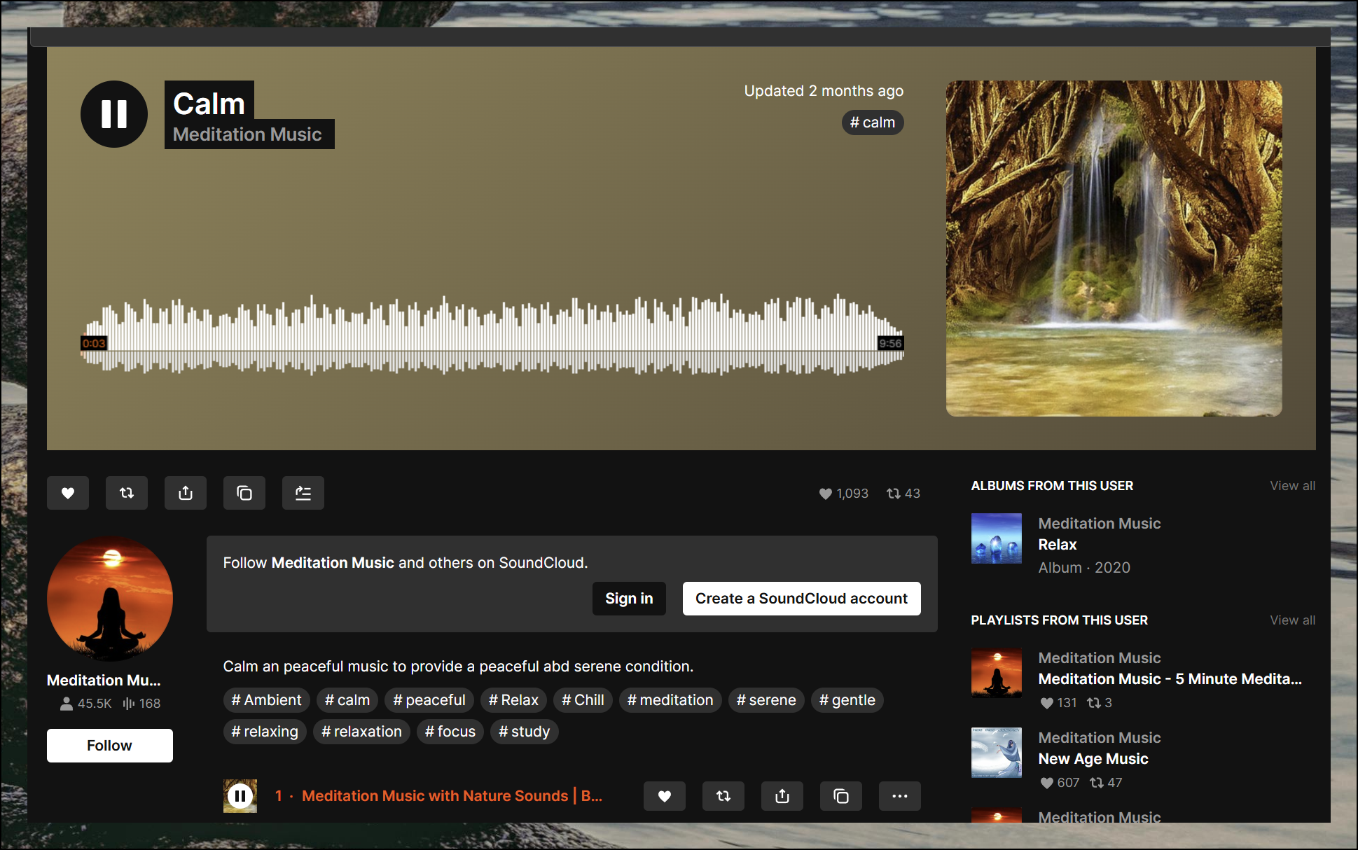 어떤 것을 들을지 고민될 때에는 해당 곡을 이용한 사람들의 댓글을 꼼꼼히 참고해 보세요. 제가 선택한 명상음악의 경우에는 천 개 이상의 댓글이 달릴 정도로 많은 사람들이 관심을 갖고 있네요. 우측에 보면 좋아요 개수도 표시가 되어 있으니 선택할 때 참고하시길 바랍니다.