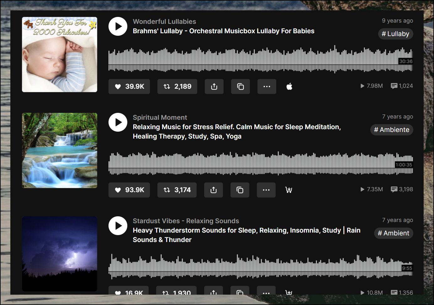 어떤 것을 들을지 고민될 때에는 해당 곡을 이용한 사람들의 댓글을 꼼꼼히 참고해 보세요. 제가 선택한 명상음악의 경우에는 천 개 이상의 댓글이 달릴 정도로 많은 사람들이 관심을 갖고 있네요. 우측에 보면 좋아요 개수도 표시가 되어 있으니 선택할 때 참고하시길 바랍니다.
