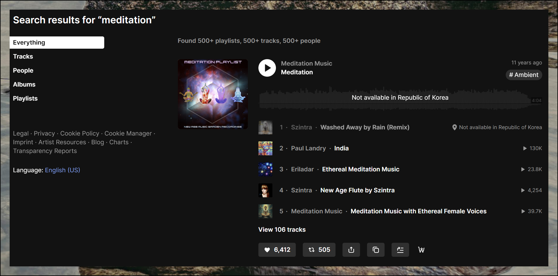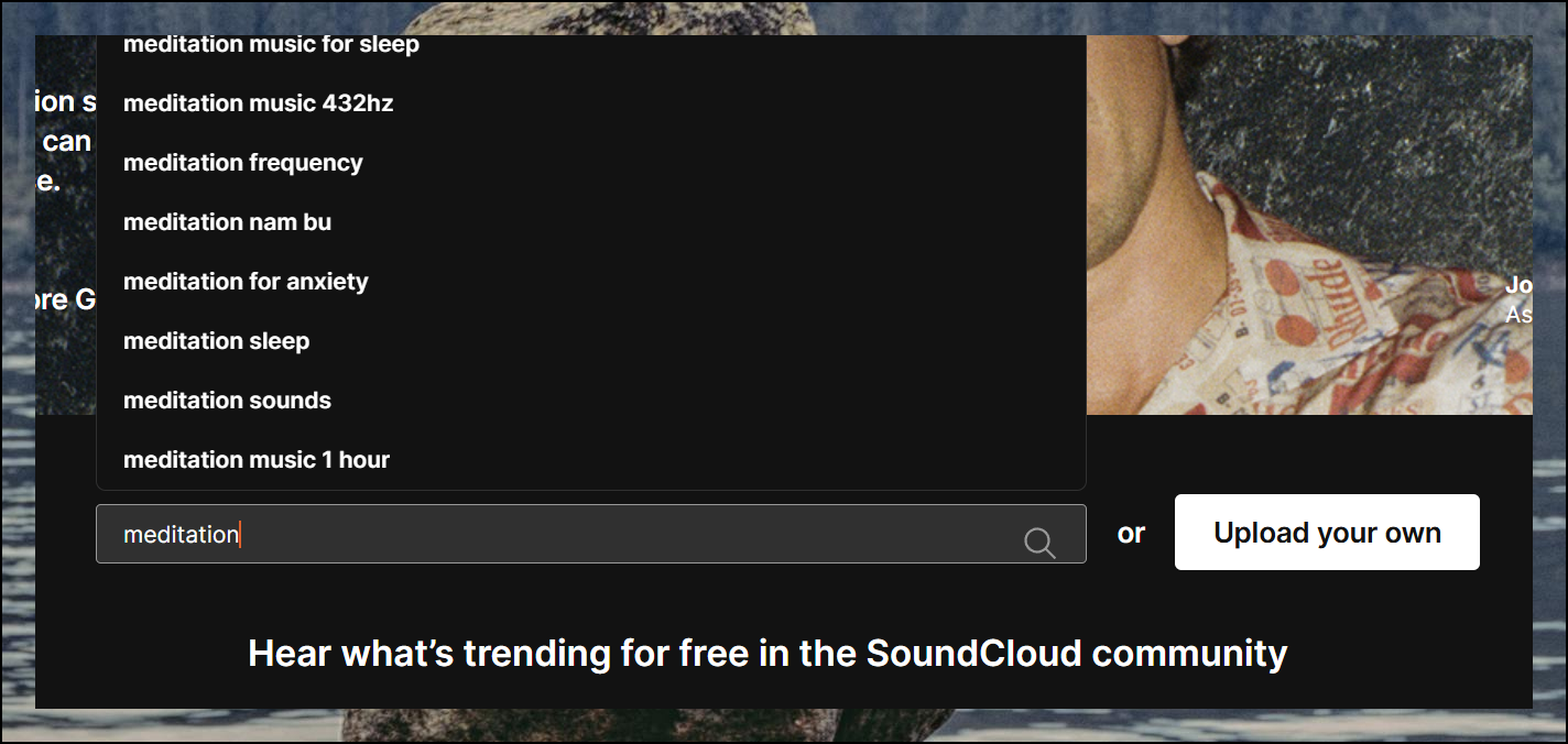 사운드클라우드 닷컴 사이트에 접속해보았어요. 이곳에서는 명상음악뿐만 아니라 다양한 장르의 곡을 무료로 감상할 수 있습니다. 국내 인기곡도 상당히 많이 있더라고요. 사이트에 접속하면 화면 중앙 상단에 검색창이 눈에 띄게 배치되어 있어요. 검색창을 클릭하고, "meditation music"를 입력한 후 엔터키를 누르시면 됩니다.