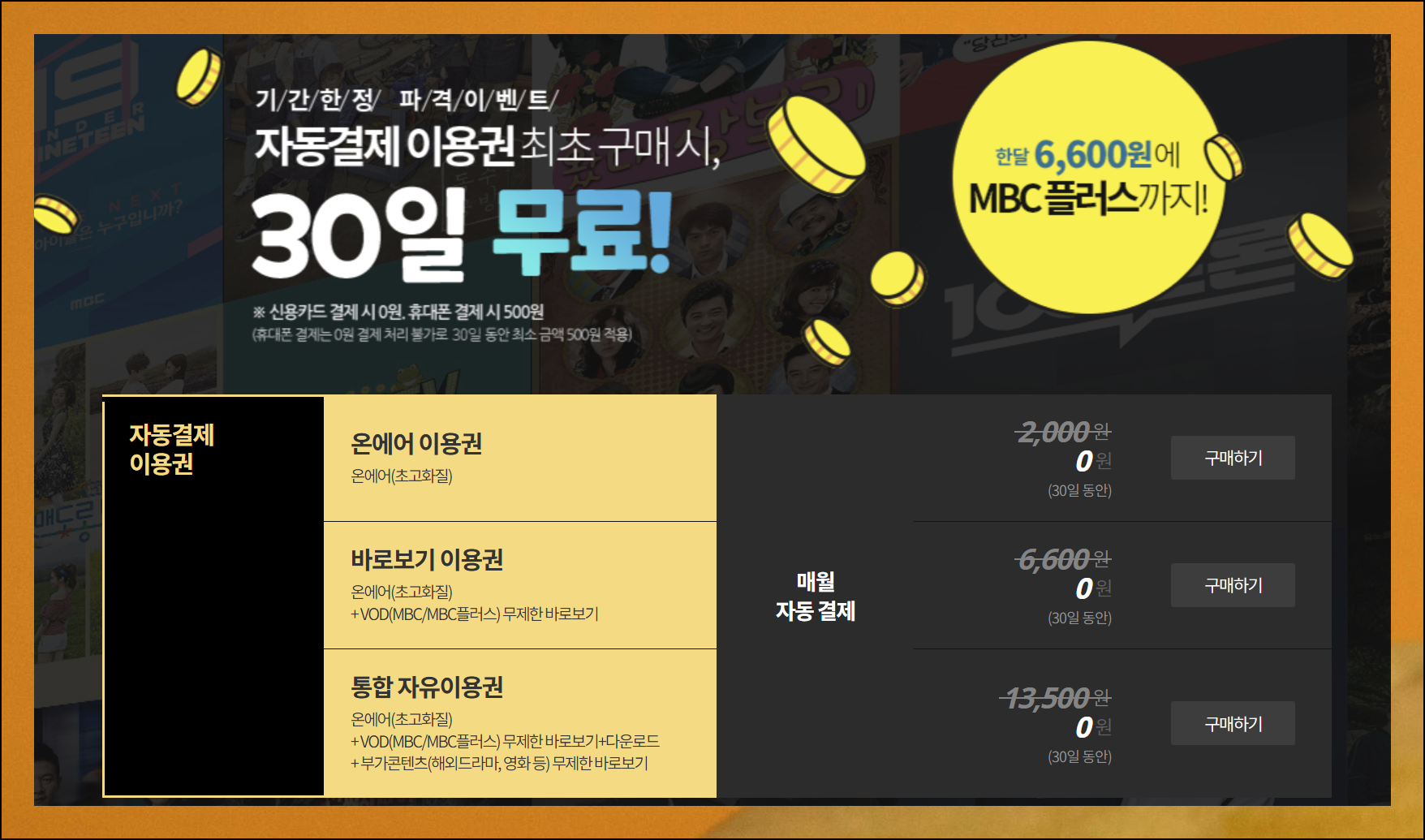 MBC 온에어 서비스는 월 정액제로 운영되고 있습니다. 매월 일정한 금액을 지불하면 MBC의 모든 콘텐츠를 무제한으로 이용할 수 있어요. 처음 가입하시는 분들을 위해 첫 달 무료 체험 서비스도 제공하고 있으니 부담 없이 시작해보실 수 있습니다. 고화질이 아닌 일반 화질은 무료 감상이 가능해요.