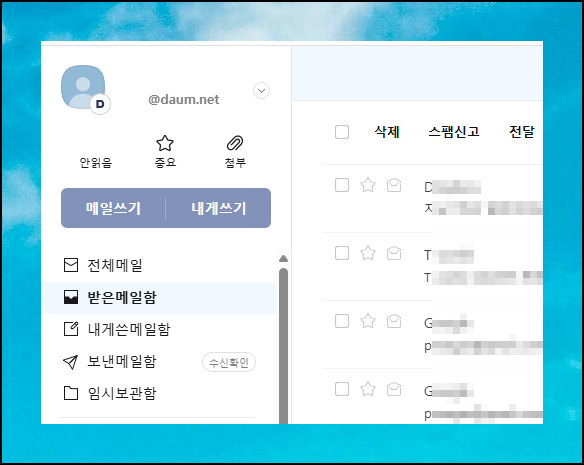 화면 왼쪽에 정렬된 메뉴들을 통해 다양한 기능들을 손쉽게 이용하실 수 있습니다. 받은 편지를 확인하고 싶으시다면 전체메일함 또는 받은메일함을 선택해 주시면 돼요. 메뉴 배치가 직관적이라서 처음 사용하는 분들도 금방 익숙해질 수 있어요.