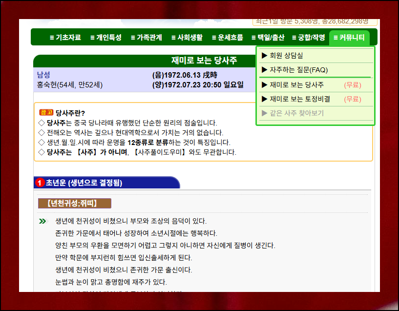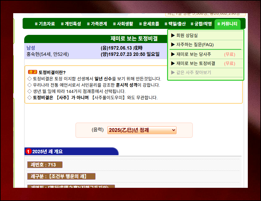 상단 메뉴에서 [커뮤니티]를 클릭하면 [재미로 보는 토정비결] 메뉴가 보일 거예요. 이 메뉴를 선택하면 토정 이지함 선생이 개발한 전통 일년 운세 시스템을 경험할 수 있습니다. 2025년은 물론 과거나 미래 연도의 토정비결도 확인 가능해요.