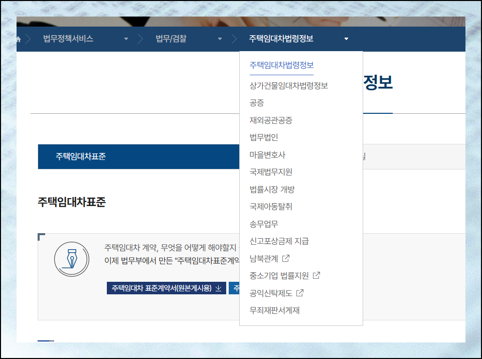 법무부 홈페이지에 접속한 다음 법무정책서비스 메뉴를 선택하세요. 이어서 법무검찰 항목으로 이동하면 필요한 전세계약서 양식을 쉽게 찾을 수 있습니다. 웹사이트 메뉴 구성이 단순하고 직관적이어서 처음 방문하는 사용자도 헤매지 않고 목적지에 도달할 수 있어요.
