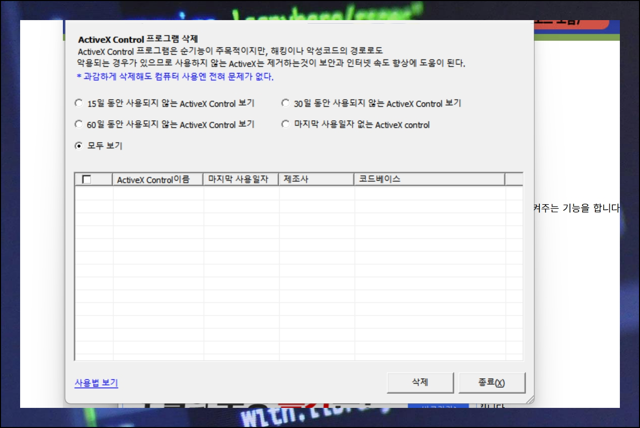 고클린의 엑티브x 삭제 기능을 클릭하면 ActiveX Control 삭제 창이 화면에 나타나요. 오랫동안 이용하지 않아서 시스템에만 남아있는 엑티브X들을 손쉽게 삭제할 수 있어요.