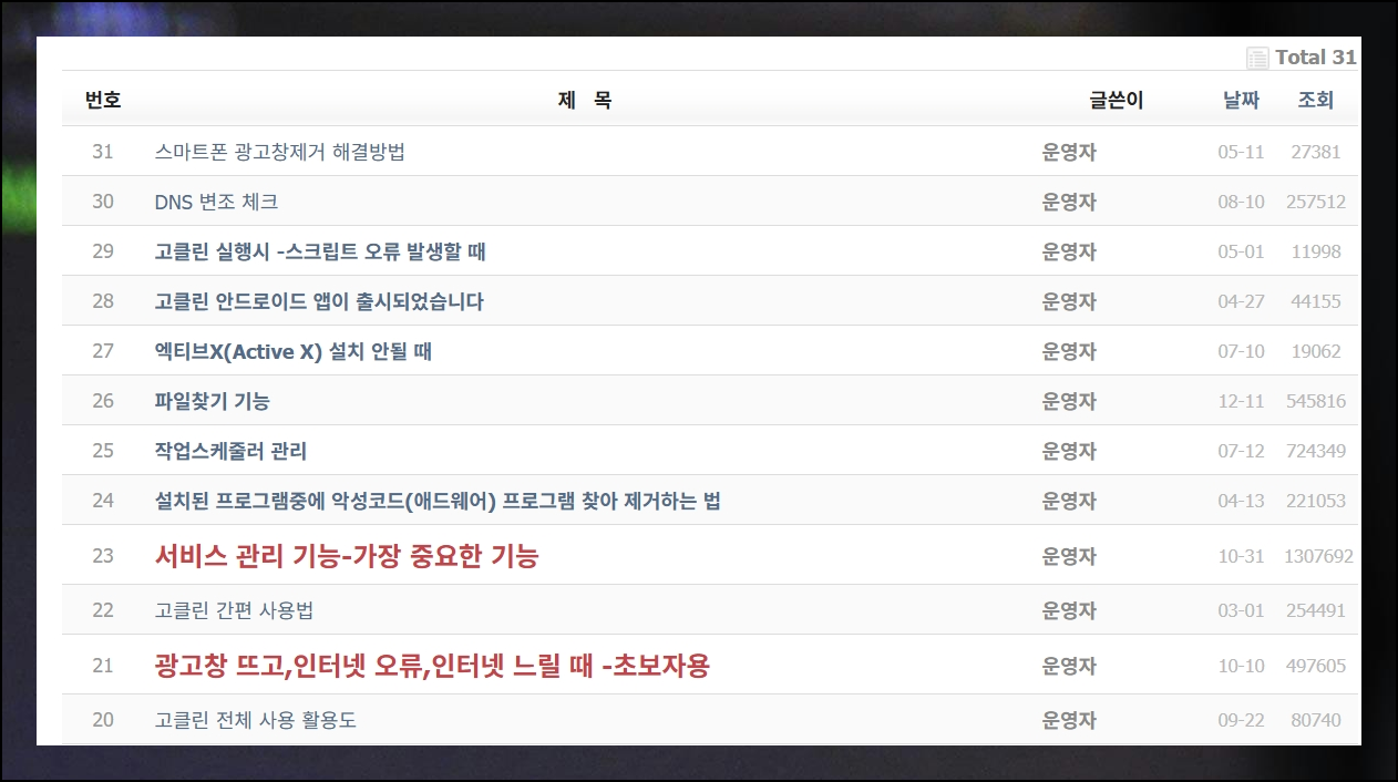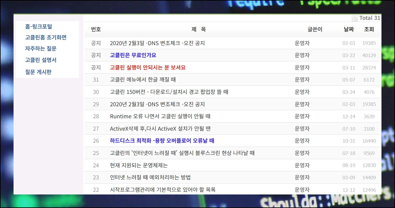 고클린을 사용하면서 문제가 발생했을 때는 자주하는 질문 게시판을 확인해보시면 됩니다. runstime 오류가 발생하거나 activex 설치가 되지 않는 상황 등 다양한 문제 상황에 대한 해결 방법이 상세히 안내되어 있어요.