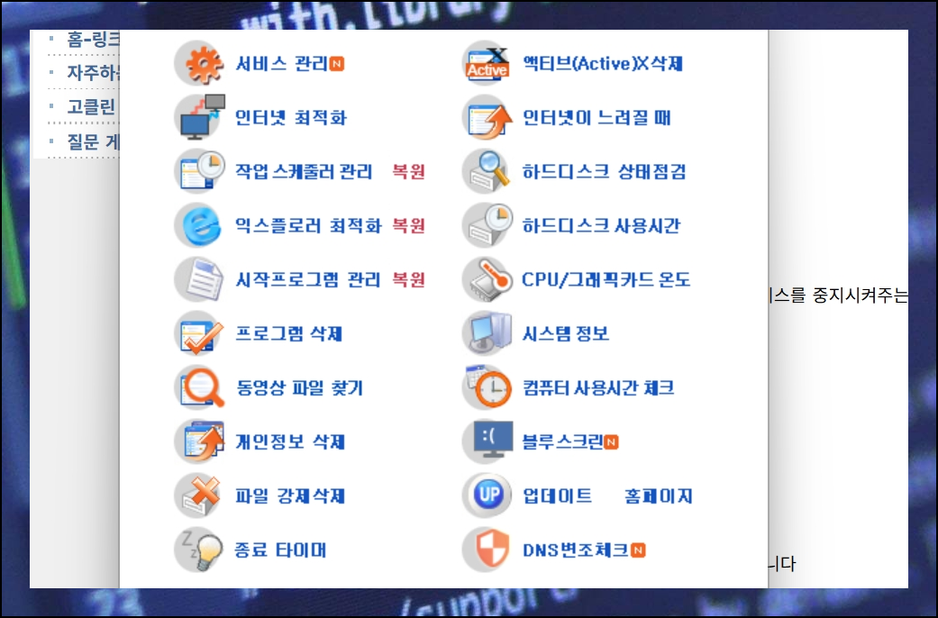 무료다운로드해서 설치한 소프트웨어를 실행해보았습니다. 컴퓨터 최적화를 위해 반드시 활용해야 하는 핵심 기능 2가지를 소개해드릴게요. 엑티브X 삭제와 시작프로그램 관리 기능이 바로 그것인데, 사용법도 매우 간단합니다.