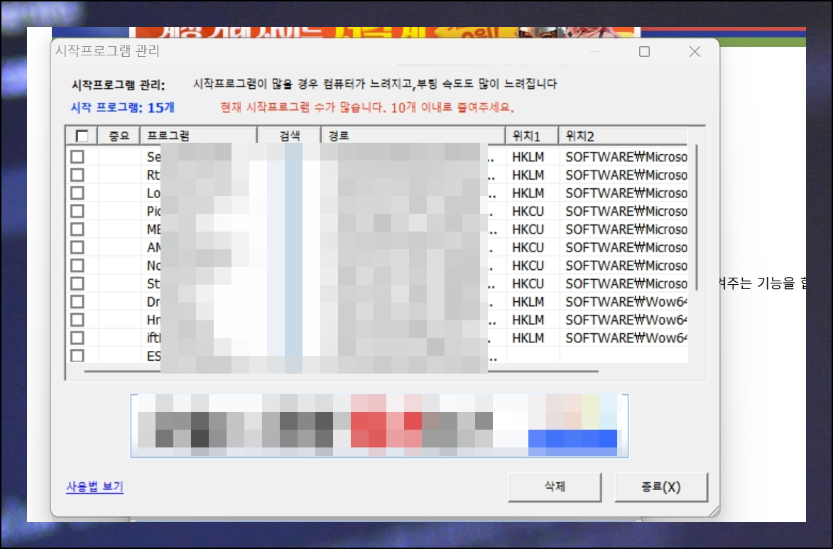 시작 프로그램의 개수가 많아질수록 컴퓨터 부팅 속도가 눈에 띄게 느려져요. 꼭 필요하지 않은 소프트웨어들은 필요할 때마다 수동으로 실행하는 것이 더 효율적입니다.