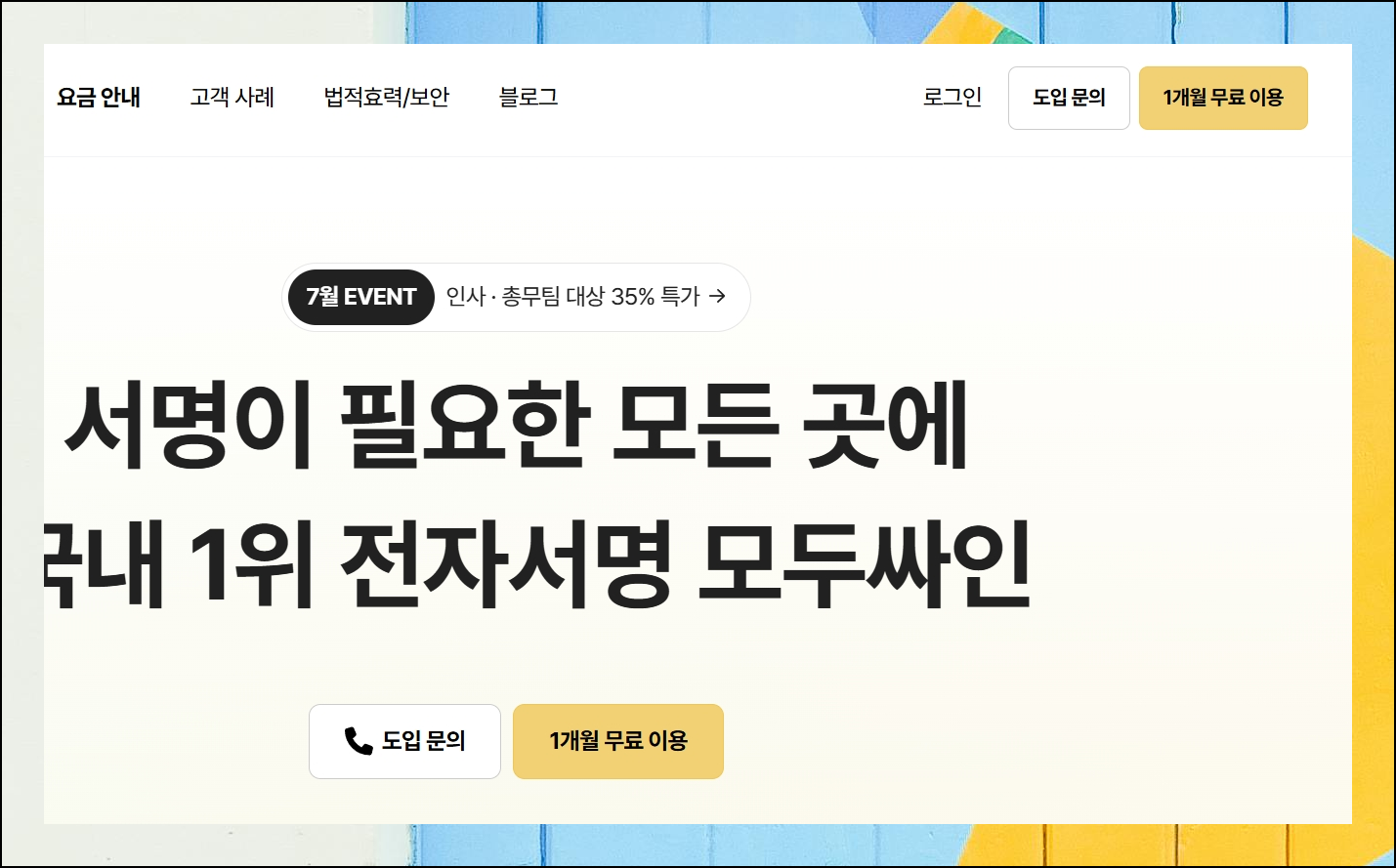 모두싸인 홈페이지 우측 상단의 로그인 버튼을 클릭해주세요. 도장 제작 서비스 이용을 위해서는 로그인 절차가 필요해요. 무료로 제한 없이 사용할 수 있지만, 회원가입 과정을 거쳐야 합니다. 아이디와 비밀번호, 이메일 주소만 입력하면 1분 안에 완료할 수 있어요.