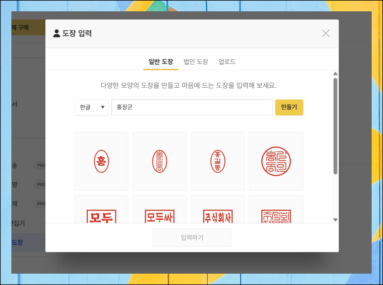 여러 디자인 옵션 중에서 가장 마음에 드는 것을 선택해보세요. 선택이 완료되면 입력하기 버튼을 클릭하면 됩니다. 이 간단한 절차만으로 전문적인 인감이 완성되니까 정말 편리해요.