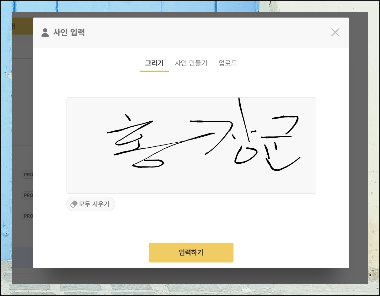 인감 제작 프로그램의 그리기 기능을 사용해서 사인을 만들어보겠어요. 마우스를 활용해 직접 사인을 그려야 하는 방식입니다. 그리기가 끝나면 입력하기 버튼을 눌러주면 됩니다.