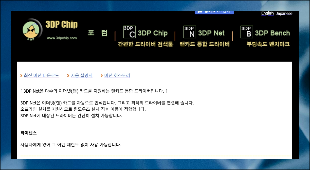 개발사의 공식 웹사이트에 접속해서 3dp net 최신 버전을 내려받으세요. 구버전보다는 최신 버전을 활용하는 것이 좋아요. 새로운 하드웨어 지원이 추가되고 안정성도 향상되어 있거든요.