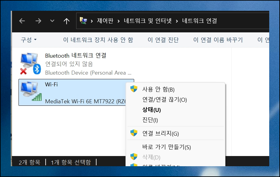 새로 열린 창에서 여러 통신 관련 항목들을 볼 수 있을 거예요. 평소에 사용하던 네트워크 어댑터를 찾아서 마우스 오른쪽 버튼으로 클릭해보세요. 그러면 상황에 맞는 메뉴가 뜨는데, "사용" 또는 "연결" 옵션을 선택하면 됩니다. 인터넷 연결이 안될때는 보통 이 설정이 "비활성화" 상태로 바뀌어 있는 경우가 대부분이에요.