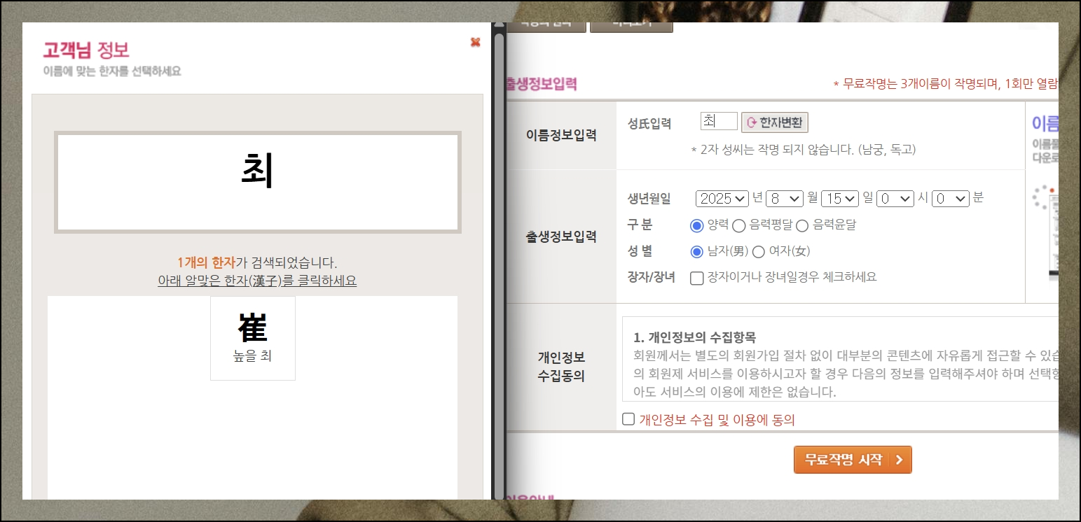 수많은 후보를 살펴보는 것보다는 실제 사용할 사람에게 적합한 것을 찾는 것이 핵심입니다. 성씨 정보와 생년월일을 정확히 기입하고, 성별 선택과 장자 혹은 장녀 여부까지 체크한 후 무료작명 시작 버튼을 눌러보세요.