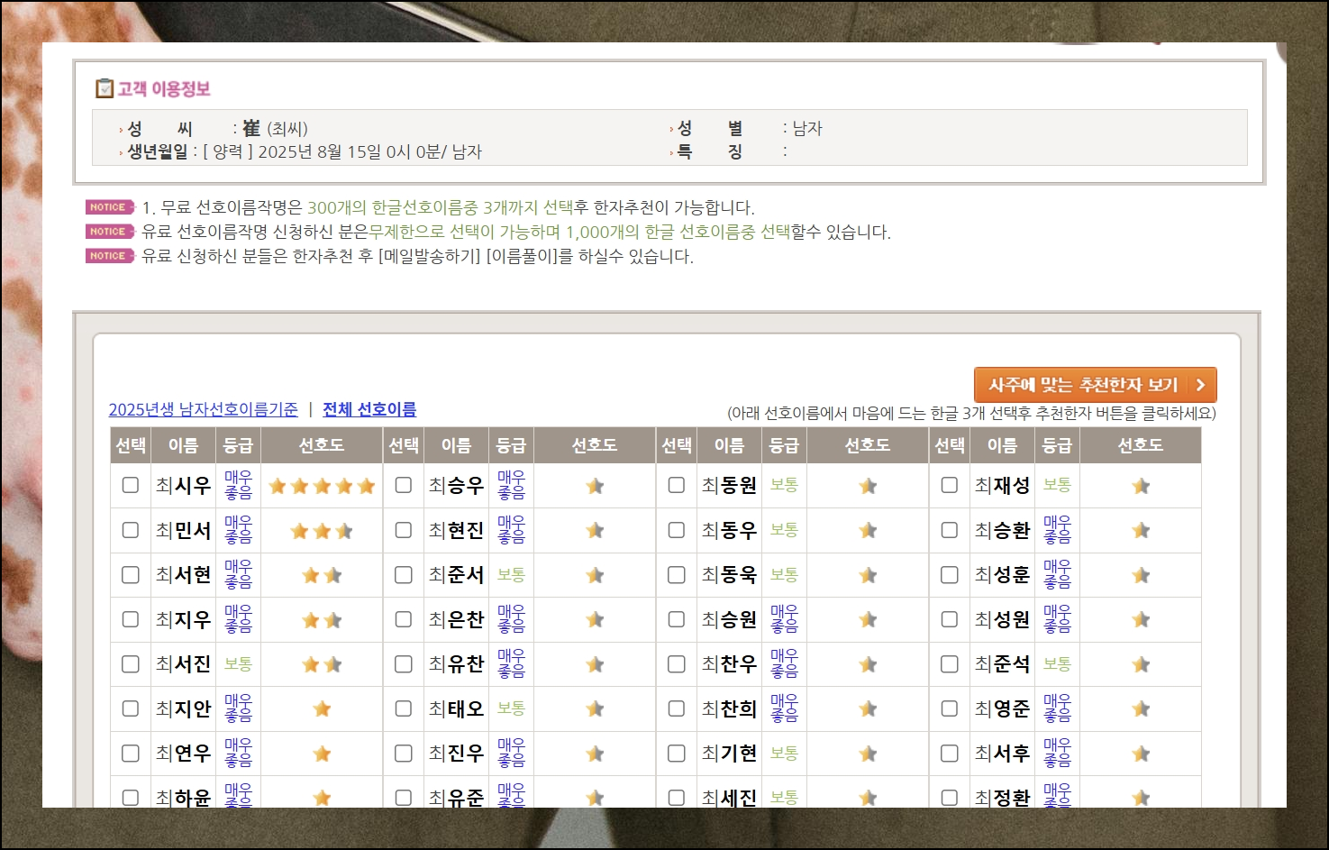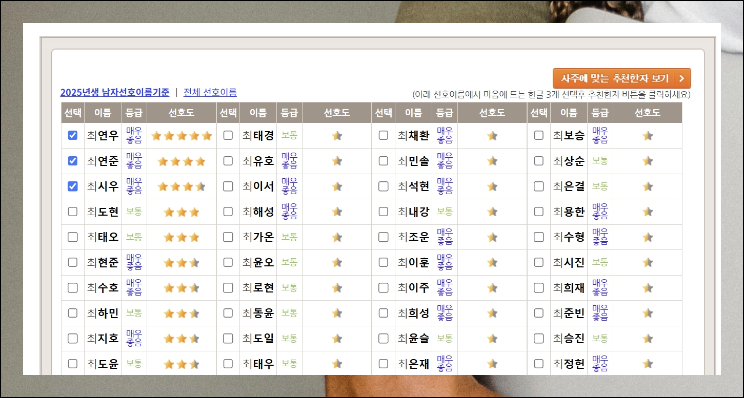 2025년생 남자 선호 기준 버튼을 클릭해보니 추가로 300개의 목록을 확인할 수 있었습니다. 이 중에서 마음에 드는 3개를 골라보세요. 선택을 마쳤다면 사주에 맞는 추천한자 보기 버튼을 눌러 다음 단계로 진행할 수 있습니다.