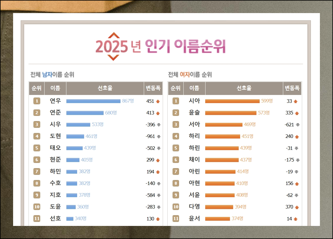 아이 이름을 정하는 일이 과거보다 훨씬 간단해졌어요. 인터넷 기반 작명 서비스를 이용하면 무료로 다양한 옵션을 살펴볼 수 있습니다. 현재 인기를 끌고 있는 남자 아이 이름들을 확인해보니 연우, 연준, 시우, 도현 등이 상위권에 올라 있네요. 여자 아이의 이름 트렌드도 동시에 제공되오니 관심 있는 분들은 함께 참고해보세요.