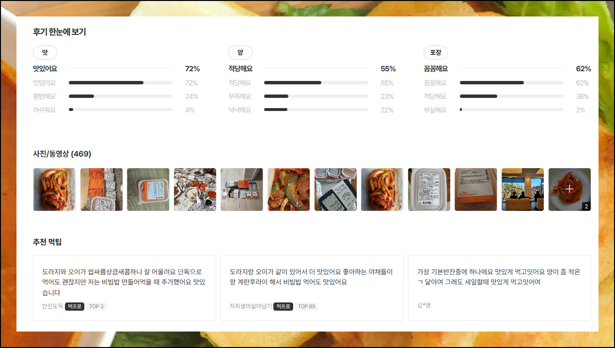 후기 섹션을 통해 실제 구매 경험이 있는 소비자들의 진실한 평가를 살펴볼 수 있어요. 이를 통해 해당 제품의 실제 맛과 품질 수준을 미리 가늠해볼 수 있습니다. 집에서 직접 조리하는 대신 간편하게 주문하여 식사를 해결하고 싶을 때 매우 중요한 참고 자료가 될 수 있죠.