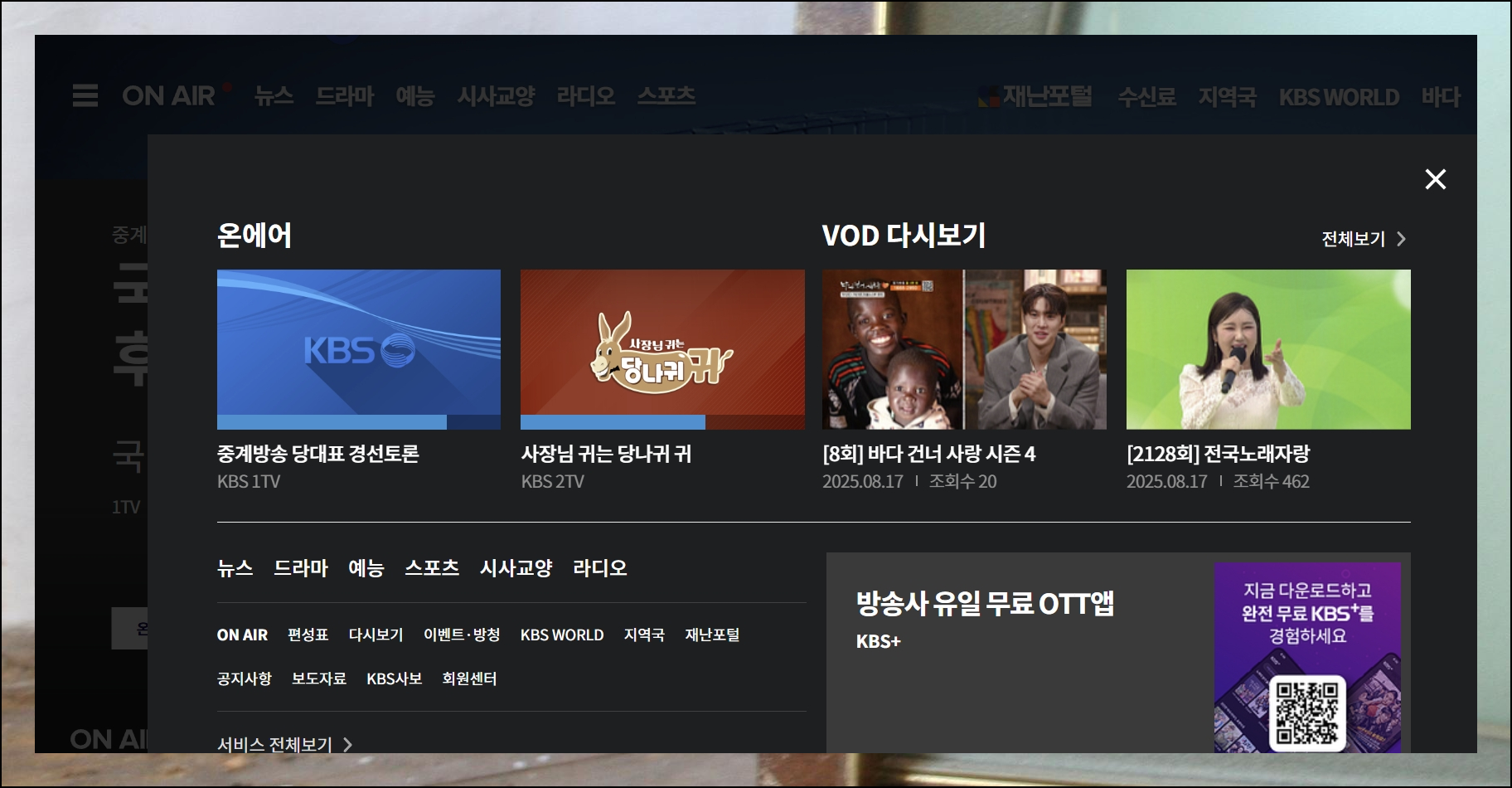 kbs 공식 홈페이지는 사용자 친화적으로 만들어져 있어서 누구나 쉽게 이용할 수 있습니다. 복잡한 가입 절차나 인증 과정 없이도 바로 tv 시청이 가능해요. 실시간으로 방영되는 프로그램을 보려면 on air 섹션을 선택하면 되고, 이미 방송된 프로그램을 찾으려면 vod 서비스를 활용하면 됩니다. tv 다시보기를 원한다면 vod를 선택해 주세요.