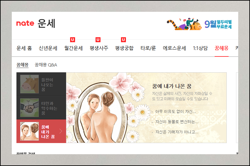 네이트 운세 서비스의 매력은 단순한 꿈해몽을 넘어서는 다양성에 있어요. 여러 종류의 점술과 역학 서비스들이 한 곳에 모여 있습니다. 메뉴에서 무료 꿈풀이 항목을 클릭하면 임신과 관련된 꿈, 별이 나오는 꿈 같은 테마별 해석도 확인할 수 있어요.