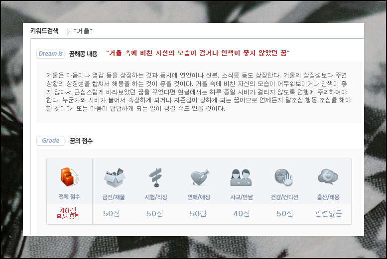 무료로 이용할 수 있는 서비스라고 해서 대충 만들어진 것이 아니라 정말 상세한 꿈풀이 내용을 만나볼 수 있습니다. 꿈 속에 등장하는 각종 상징들의 숨은 의미부터 시작해서 앞으로의 운세 전망까지 종합적으로 다루고 있어요. 보통 40점 정도가 평범한 수준의 꿈이고, 점수가 높아질수록 좋은 의미로 해석된다는 기준도 기억해두시면 도움이 될 겁니다.
