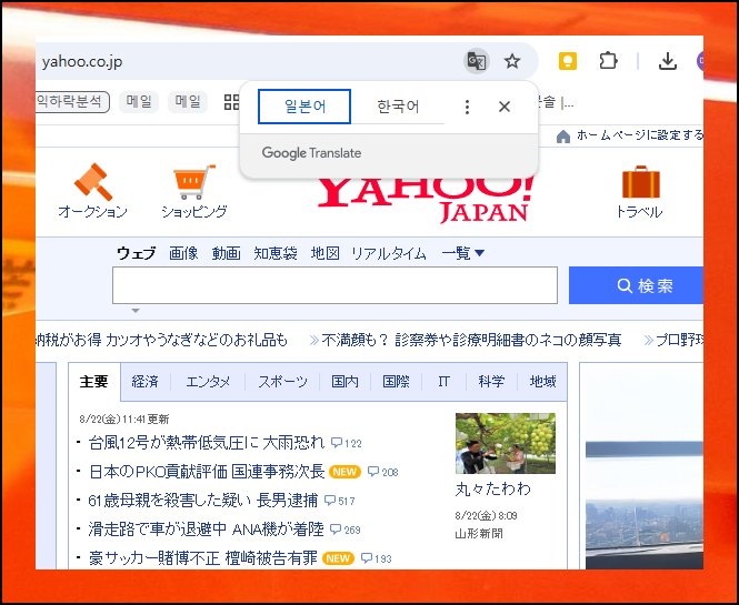 일본의 주요 포털 사이트인 야후 재팬 메인 페이지를 보여드릴게요. 클릭 한 번으로 한국어 번역 화면을 확인할 수 있어요.