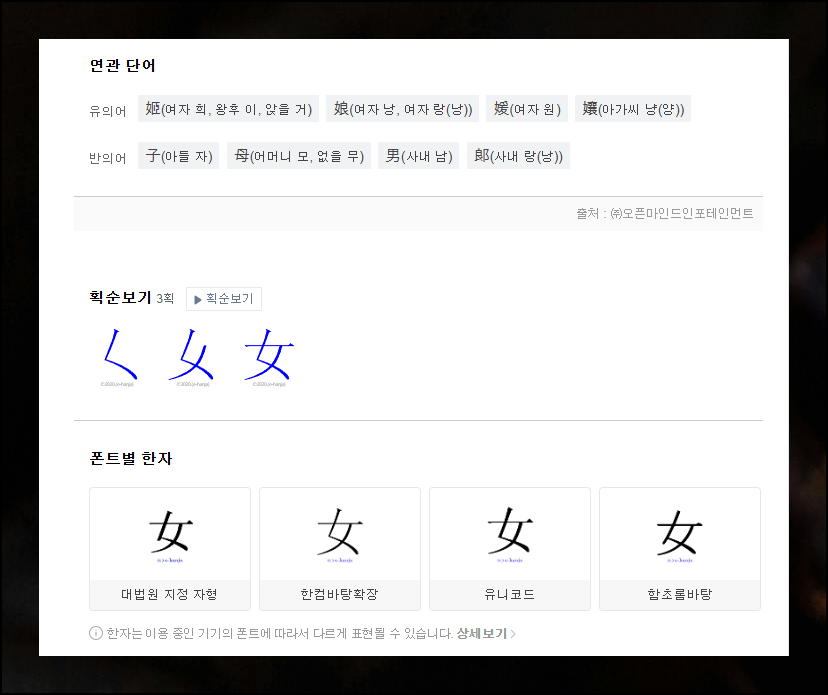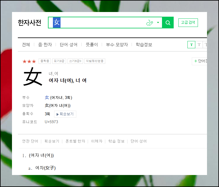 한자를 클릭해서 선택하면 부수와 총획수, 유니코드, 모양자, 난이도 등 여러 정보를 한 화면에서 모두 볼 수 있어요. "여자 녀" 같은 글자를 네이버 옥편에서 찾아보면 다양한 뜻과 사용 예시까지 상세하게 나와 있습니다.