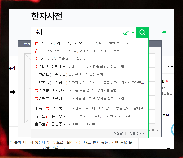 필기인식기 창이 열리면 마우스를 사용해서 알아보고 싶은 한자의 모양을 그려보세요. 대충 그려도 시스템이 비슷한 모양의 문자 20개를 추천해주기 때문이에요. 찾던 글자를 선택하면 검색창에 자동으로 입력되고, 자동완성 기능을 통해 관련된 단어나 고사성어까지 확인할 수 있어요.