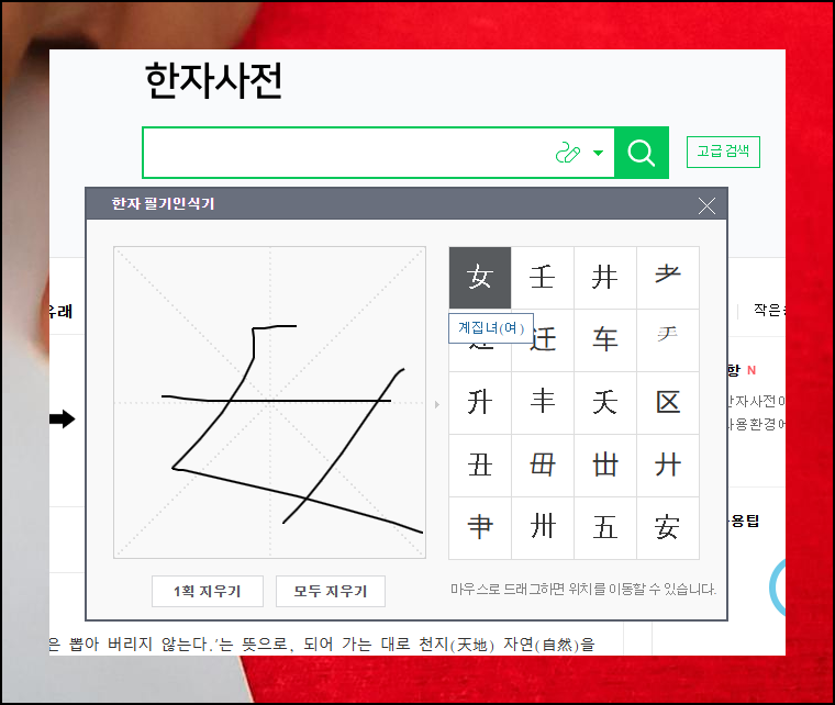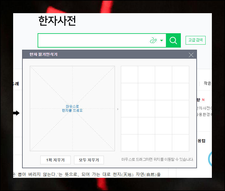 네이버 옥편을 제대로 활용하려면 검색창 오른쪽에 있는 필기 모양의 아이콘을 클릭해보세요. 이 버튼을 누르면 필기인식기 창이 새로 열립니다. 한자의 생긴 모양은 아는데 읽는 방법이나 의미를 모를 때 이 기능이 정말 도움이 돼요.