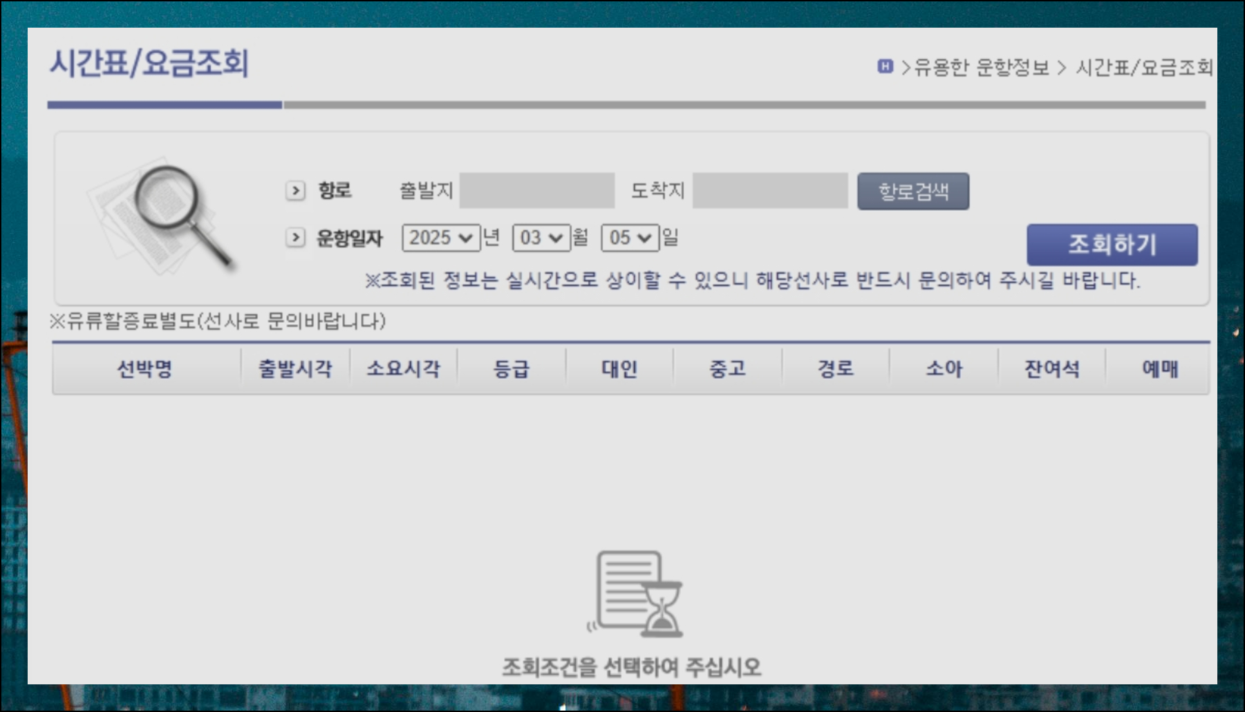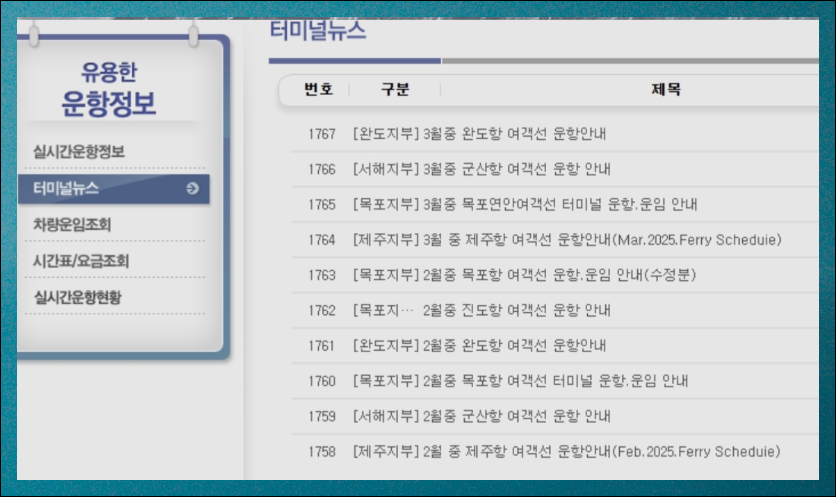 바다는 예측 불가능한 곳이라서 배 운항 계획이 갑작스럽게 변경되기도 해요. 터미널 뉴스 섹션을 통해 최신 공지사항을 놓치지 마세요. 게시판에서 여수 관련 검색을 하면 업데이트된 스케줄을 즉시 찾을 수 있어요. '시간표/요금조회' 버튼을 클릭해서 다음 단계로 넘어가면 됩니다.