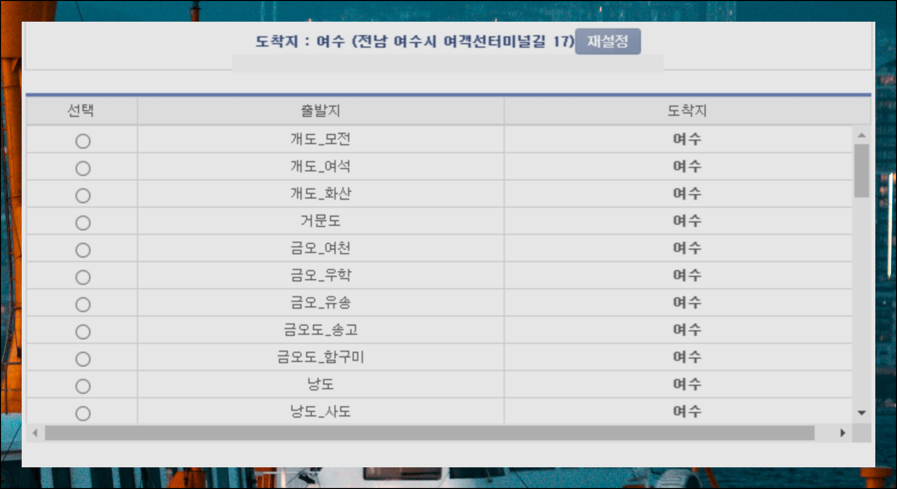 목적지를 '여수'로 설정하면 마법 같은 일이 일어나요. 전국 각지에서 여수항으로 향하는 모든 여객선 정보가 한눈에 들어옵니다. 부산과 통영, 거제도에서 출발하는 다양한 배편들이 화면에 나타나요. 설정을 완료하고 검색 버튼을 누르면 상세한 운항시간표를 확인할 수 있습니다.