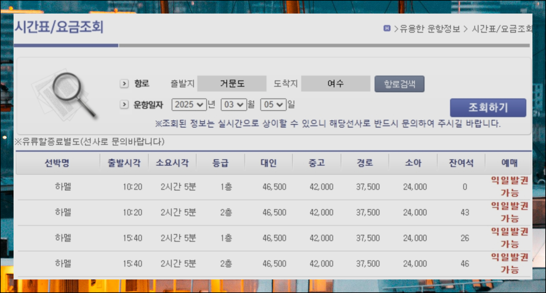 운항 날짜를 지정하고 조회하면 여수 도착 배편의 모든 세부사항이 펼쳐져요. 출발 시간부터 이용 요금, 이동 시간, 잔여 좌석까지 완벽하게 파악할 수 있습니다. 거문도에서 출발하는 "하멜" 여객선도 정기 운항 중이에요. 여수 여객선터미널로 가는 스케줄을 꼼꼼히 검토해서 개인 일정에 딱 맞는 배편을 선택하세요.