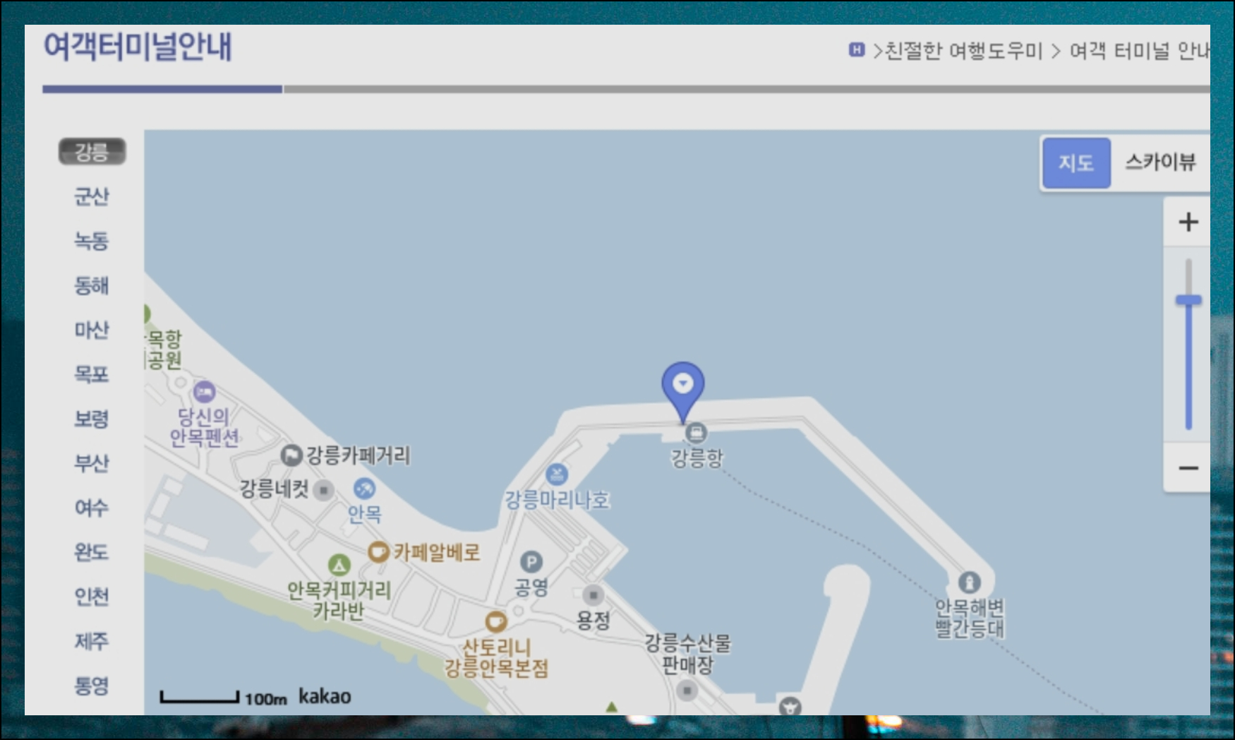 메뉴에서 '운항시간표 조회'를 선택하시면 놀라운 광경이 펼쳐져요. 강릉부터 목포까지 전국 주요 항구의 선박 정보가 체계적으로 정리되어 있습니다. 군산, 녹동, 동해, 마산 등 지역별 분류가 명확해서 찾고자 하는 데이터에 빠르게 접근할 수 있어요. 초보 여행자도 쉽게 이해할 수 있게 직관적으로 구성되어 있습니다.