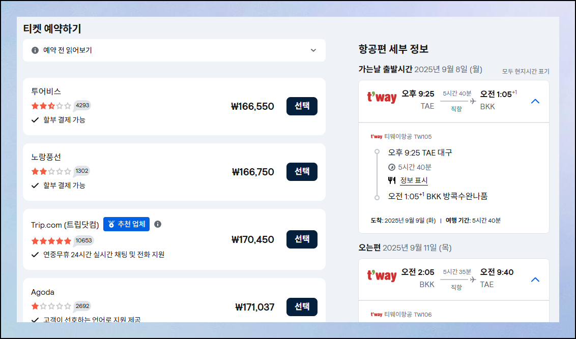 반대로 태국으로 갈 때 이용하는 공항에 따라 우리나라 지역도 선택이 가능합니다. 대구, 서울, 부산, 제주 등 여러 지역이 나오는데요. 어떤 지역을 선택하느냐에 따라서도 항공권 가격이 달라요.