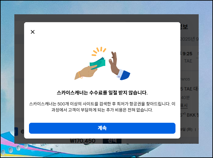 구체적으로 예매할 수 있는 태국행 티켓 정보를 한번 살펴보겠어요. 실제 비행시간은 5시간 40분에서 50분 정도로 나와 있습니다. 이렇게 결과화면을 통해 소요시간을 정확히 확인하실 수 있어요. 항공권 리스트에서 원하는 조건을 찾으셨다면 선택하기를 클릭해보세요. 그러면 즉시 예매 단계로 이동이 가능합니다. 참고로 스카이스캐너에서는 수수료를 받지 않는다고 하네요.