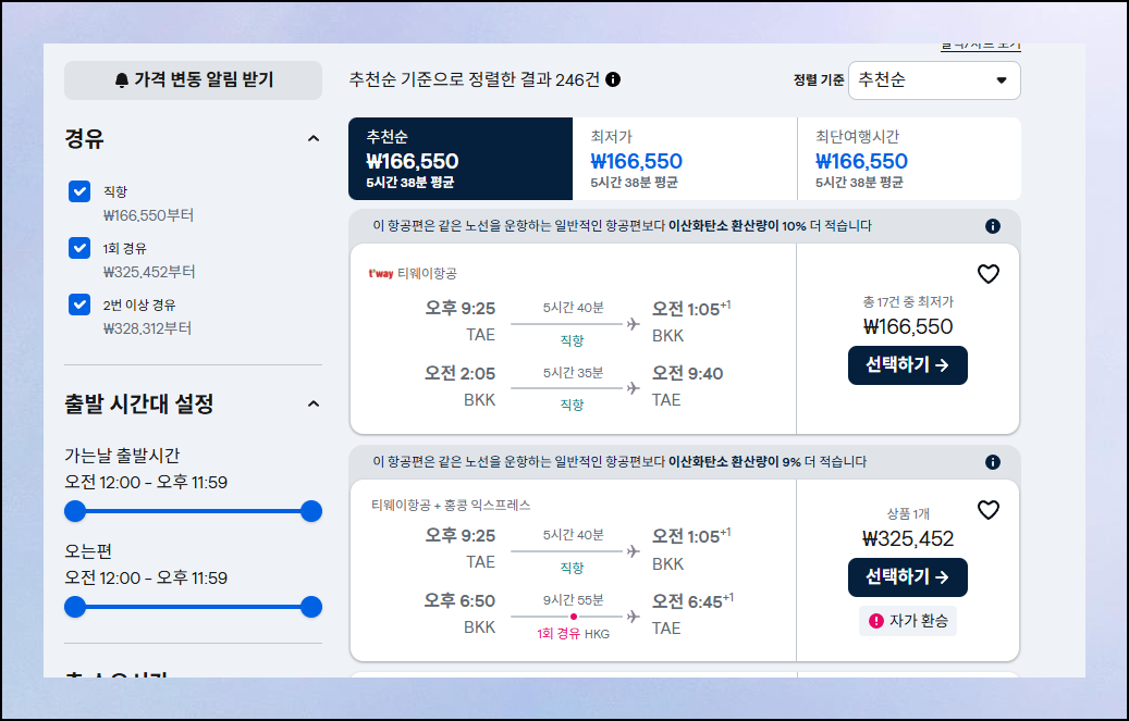 우리가 찾은 금액으로 바로 예약이 가능합니다. 여기에서 한 가지 팁을 알려드립니다. 더욱 저렴한 항공권을 원하신다면 요금 변동 알림 기능을 꼭 활용해보시길 바래요. 항공편을 선택하는 리스트에서 좌측에 보면 알림 설정 기능이 있습니다.
