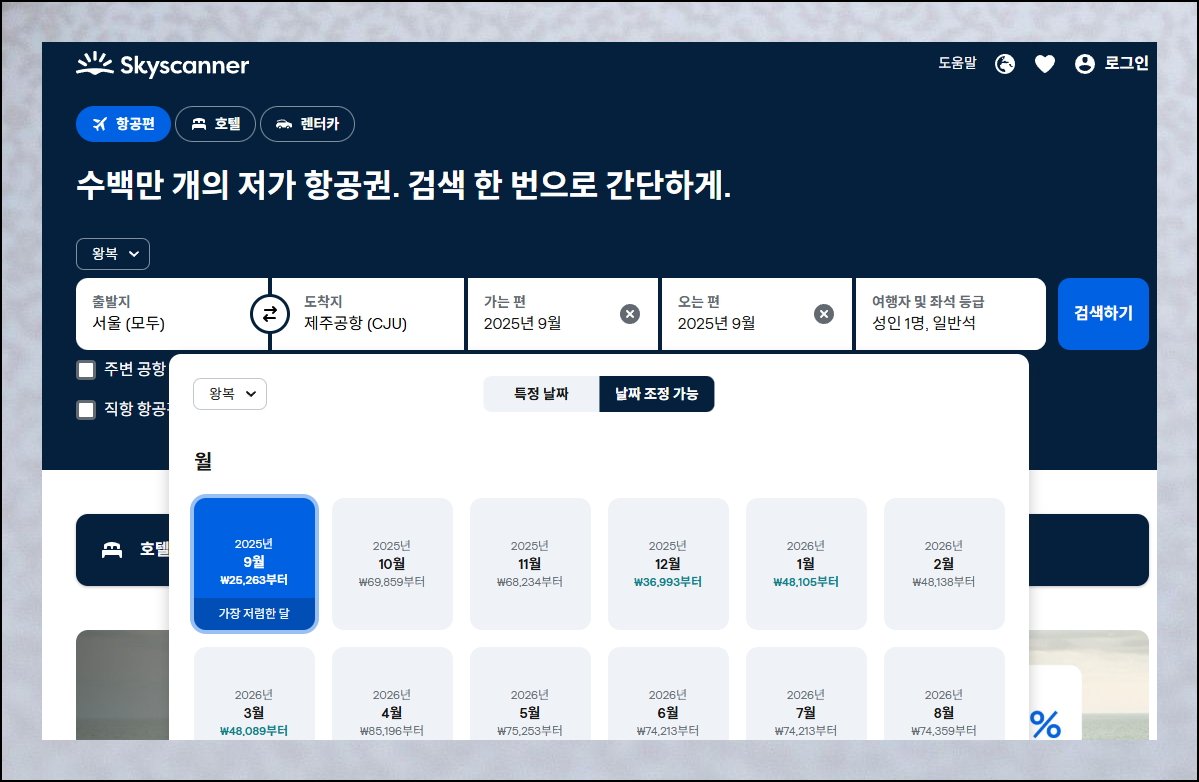 여행 계획을 세울 때 올바른 서비스를 선택하는 것이 중요해요. 직접 여러 곳을 이용해보고, 자신에게 가장 잘 맞는 것을 선택하면 되는데요. 제 경우에는 스카이스캐너를 이용합니다. 이곳에서는 항공권만 검색하는 게 아니라 숙박과 렌터카까지 한 곳에서 확인할 수 있어서 편리해요. 최저가로 국내선 예약을 하는 방법을 알려드릴테니 천천히 따라해 보시길 바랍니다.