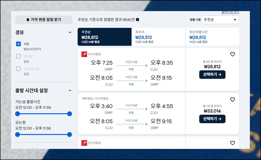시간대별 항공편 목록에서 적합한 옵션을 선택해보세요. 제주도행을 조회했을 때 28,812원 정도로 꽤 저렴한 가격의 항공권을 발견했어요. 왼쪽 시간대 설정으로 선호하는 출발 시간대만 지정한 후, 그 안에서 최저가를 찾는 것도 가능합니다. 아무래도 너무 이르거나 너무 늦게 공항에 도착할 수 없을 수 있기 때문에 본인의 상황에 맞게 잘 설정해 보세요.