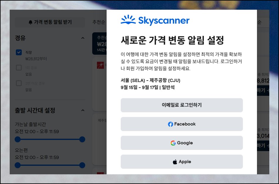 현재 조회된 항공료가 예산을 초과해도 실망하지 마세요. 사이트에서 제공하는 요금 변동 알림 서비스를 설정하면 가격이 내려갈 때마다 자동으로 알려줘요. 이런 스마트한 기능으로 원하는 가격대에서 예약할 기회를 놓치지 않을 수 있습니다. 국내선 할인 티켓을 찾고 계신다면 반드시 활용해보세요.