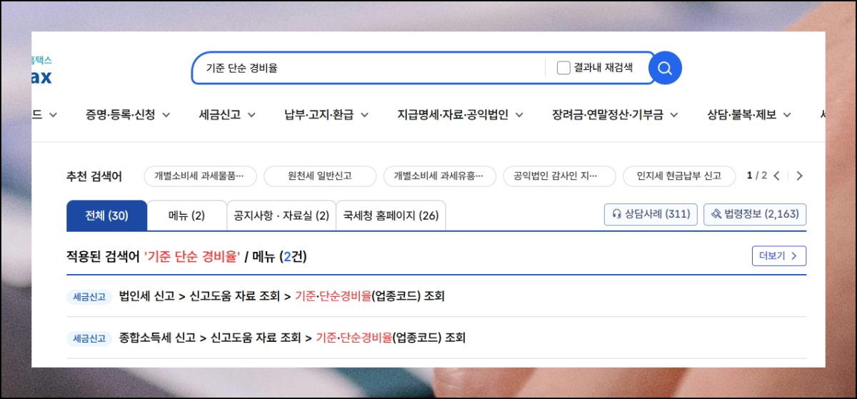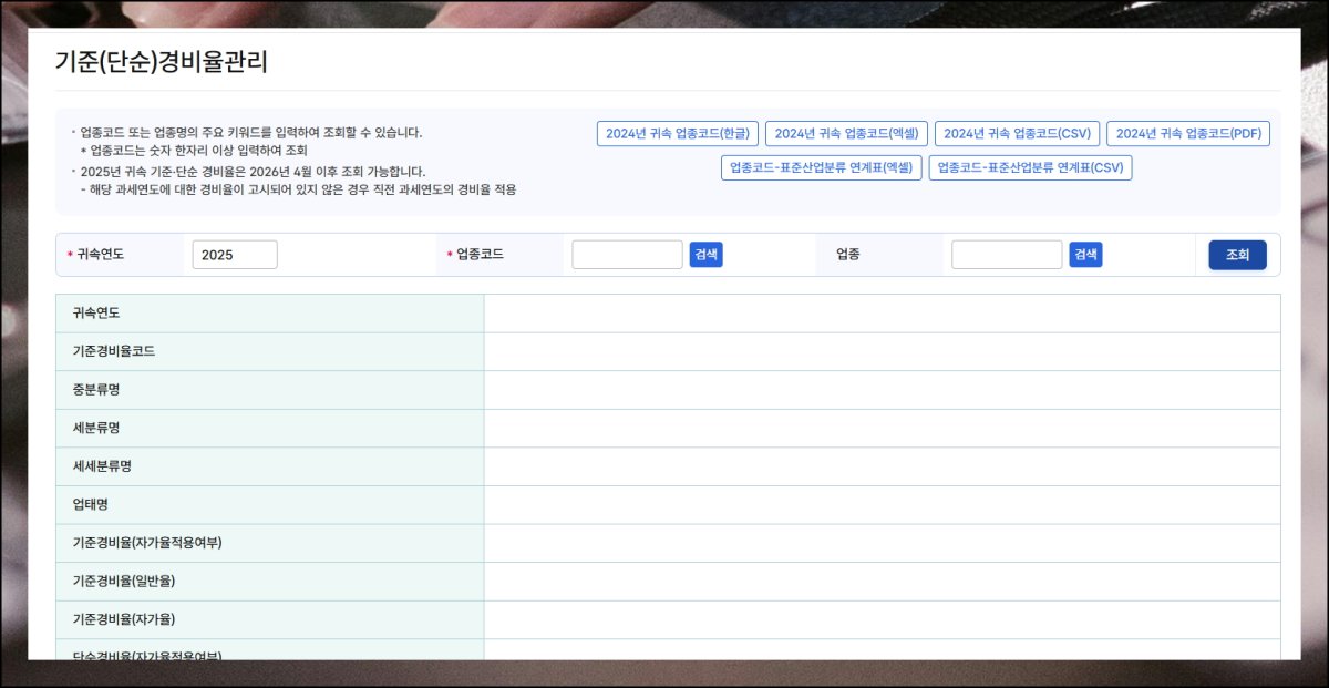 항목이 다양해서 처음에는 어디로 이동해야 할지 헷갈릴 수 있어요. 화면 우측에 위치한 기준 단순 경비율 메뉴를 찾아서 선택해주세요.