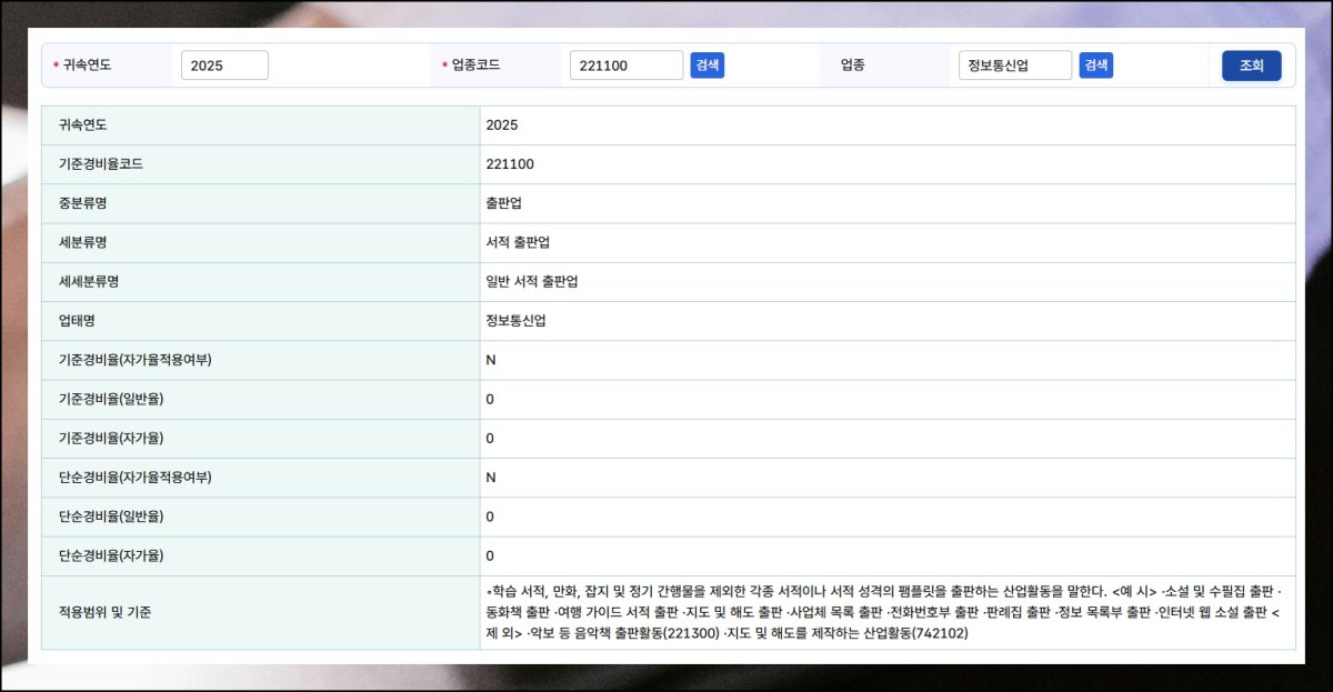 정보통신업 221100의 구체적인 정보를 확인해보세요. 귀속연도, 기준경비율, 중분류명, 세분류명 등 사업자등록에 필요한 모든 세부사항을 한 화면에서 파악하실 수 있습니다.
