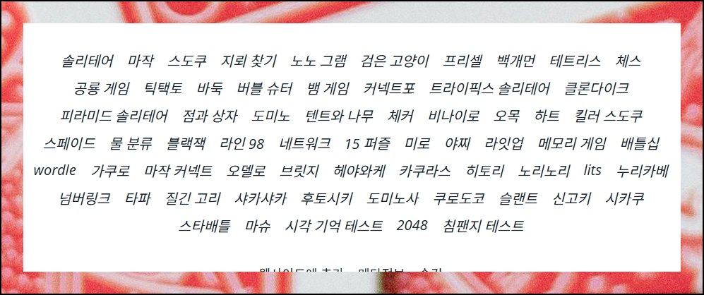 스파이더 외에도 흥미로운 퍼즐 게임들이 한자리에 모여 있어요. 오목, 도미노, 스도쿠, 지뢰찾기 같은 클래식한 놀이들을 별도 다운로드 없이 웹에서 바로 즐길 수 있습니다. 간단한 두뇌 운동에 적합한 콘텐츠들이 풍부하게 준비되어 있고, 모든 서비스가 무료로 제공되니까 부담 없이 이용해보세요.