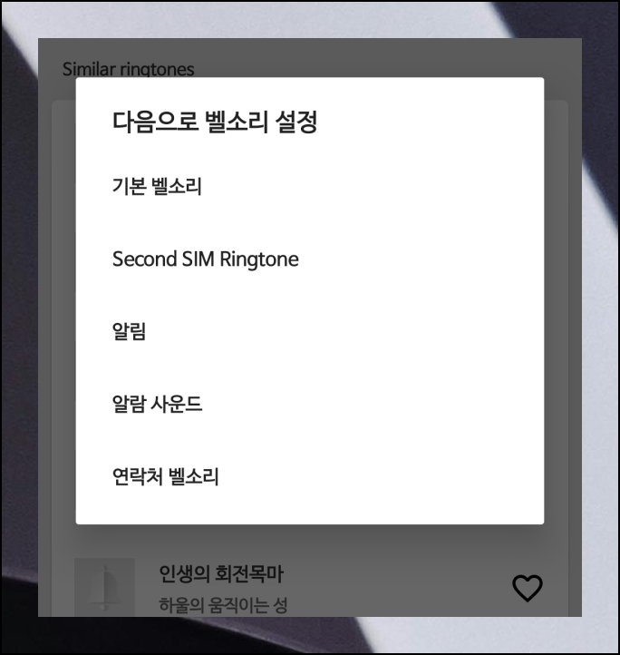 원하는 트랙을 발견했다면 클릭해서 미리 감상해보세요. 마음에 들면 다운받기 버튼을 누르면 벨소리 설정 옵션이 나타납니다. 기본 통화음, 알림음, 알람 사운드, 특정 연락처 전용 벨톤 등 네 가지 중에서 선택할 수 있어요. 옵션 선택을 통해 손쉽게 설정 및 다운받기 진행할 수 있습니다.