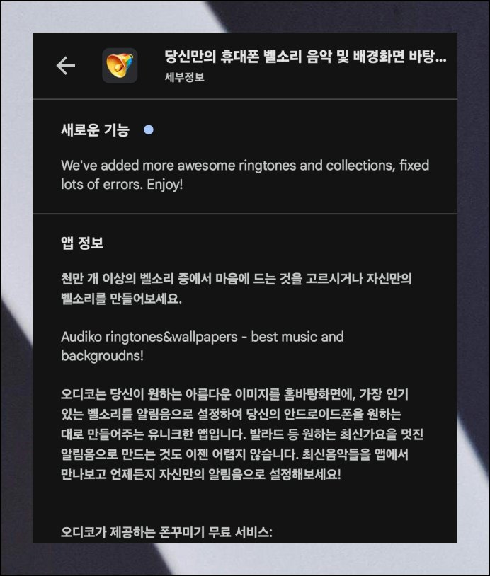 먼저 AUDIKO라는 전용 어플을 설치해야 합니다. 구글 플레이 스토어에서 손쉽게 검색할 수 있는 무료 앱이에요. 전화 벨소리 관련 기능과 함께 배경화면용 이미지도 함께 제공합니다. 두 가지 함께 사용하면 좋을 거에요. 무료 서비스라서 부담 없이 시작할 수 있습니다.