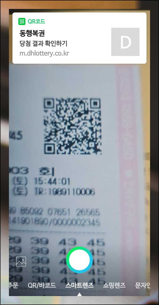 복권 용지 오른쪽 상단에 있는 바코드를 스마트폰 카메라로 비춰보세요. 코드가 제대로 인식되면 화면 위쪽에 로또 관련 메뉴가 자동으로 표시됩니다.