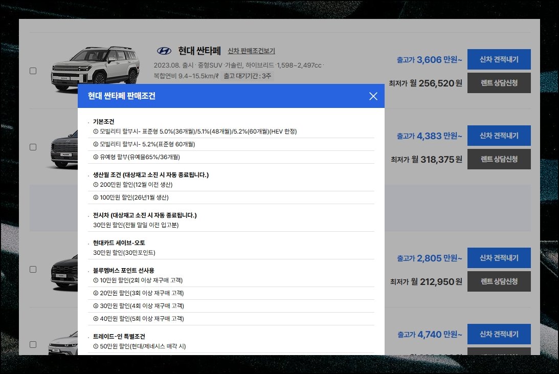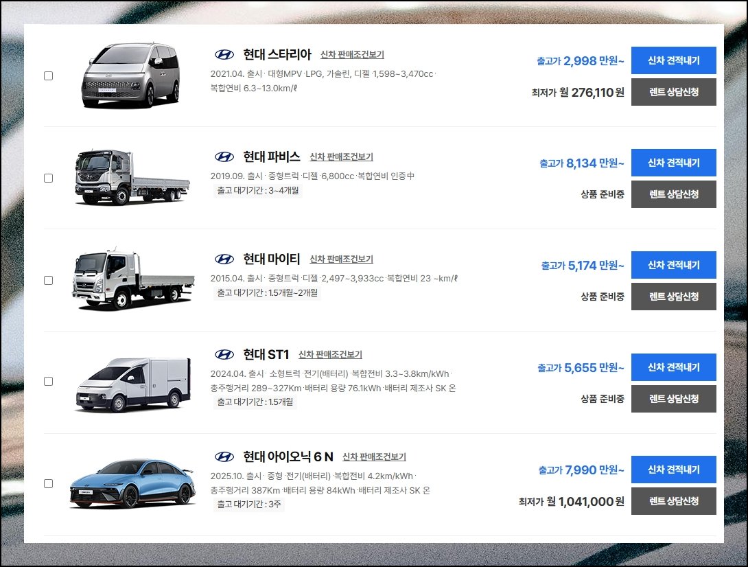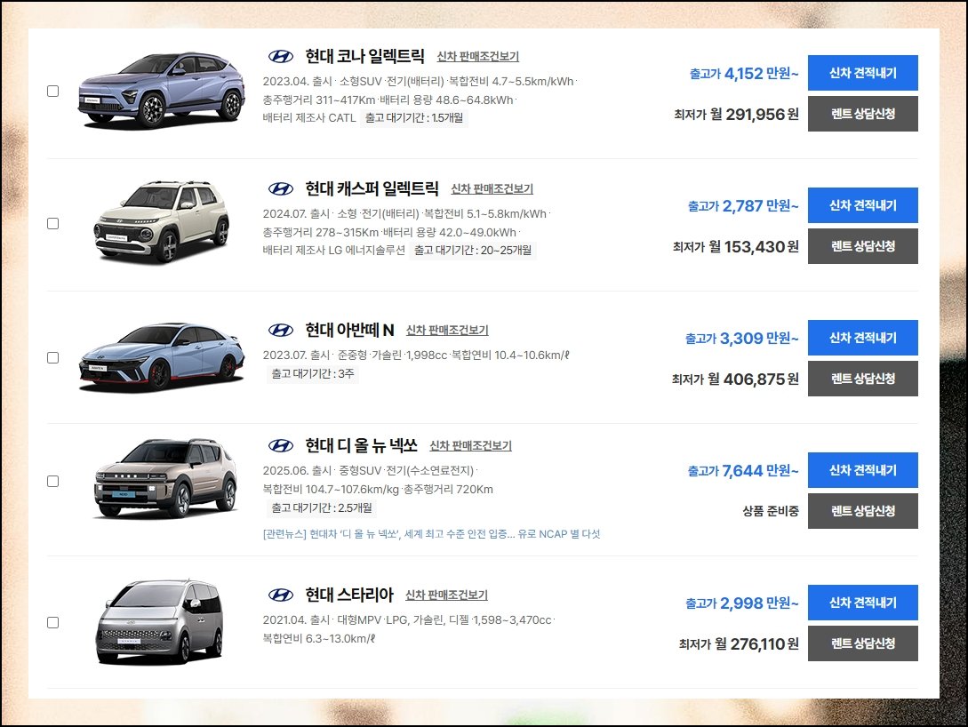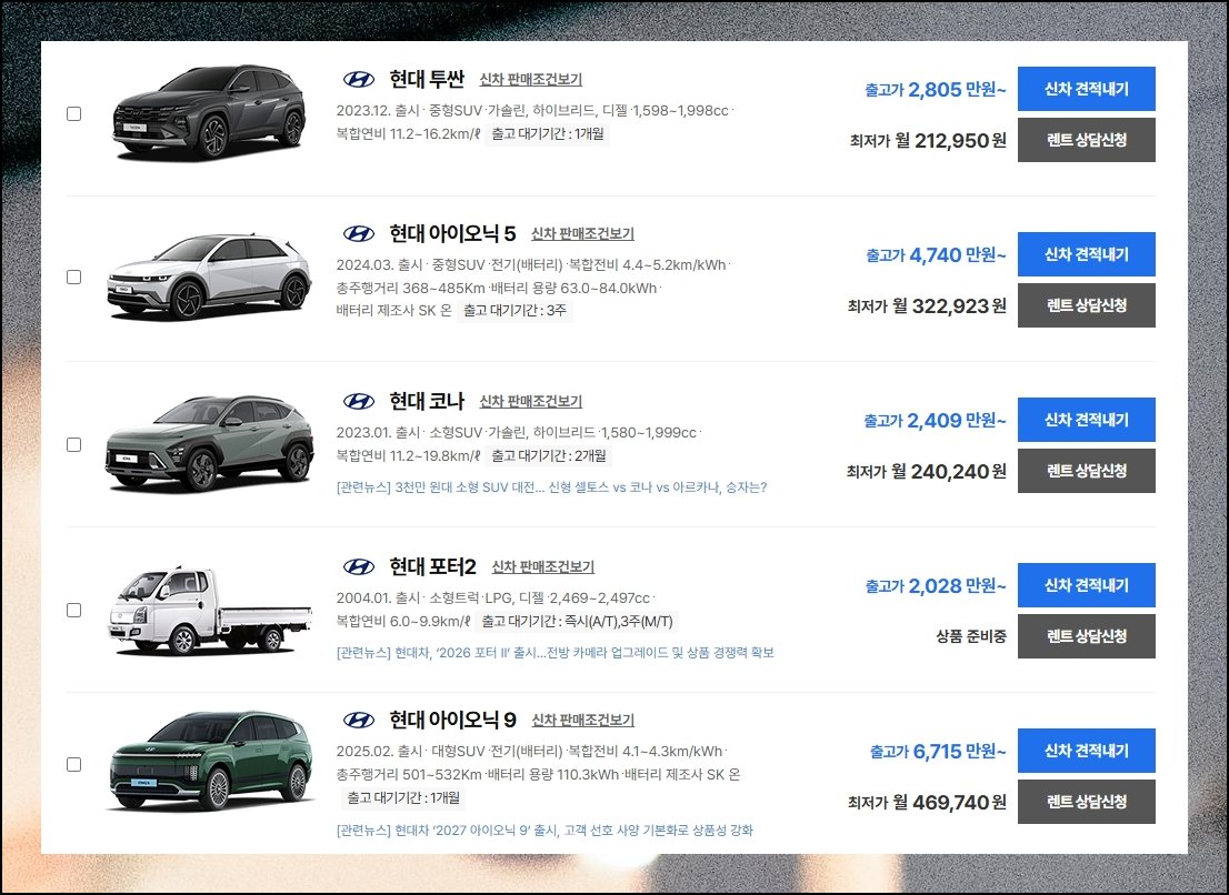 경차부터 대형 SUV까지 폭넓은 현대차 라인업을 한 화면에서 살펴보고, 월별 할인 조건과 온라인 견적 기능까지 함께 점검해보세요. 다양한 종류를 직접 비교하다 보면 예산과 용도에 딱 맞는 선택지가 자연스럽게 좁혀질 거예요.